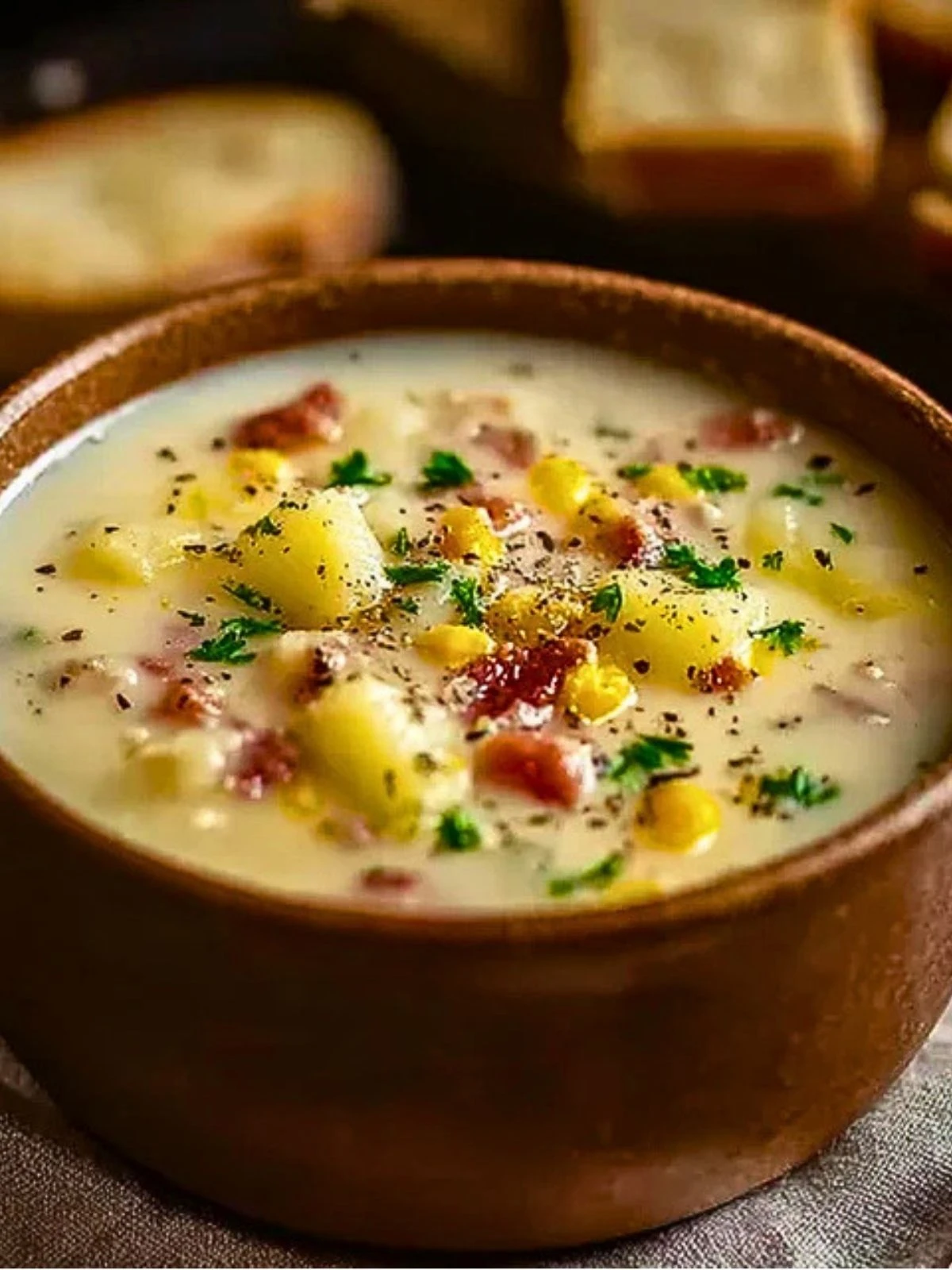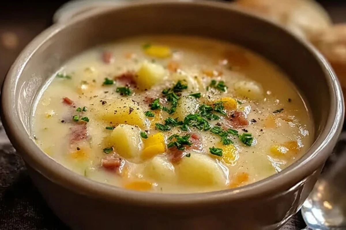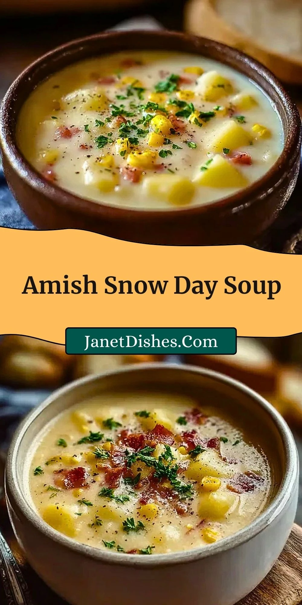 Amish Snow Day Soup is a creamy, hearty potato soup loaded with tender vegetables, cheddar cheese, corn, and crispy bacon, making it the perfect cozy comfort food recipe for cold nights, family dinners, and easy homemade winter meals.