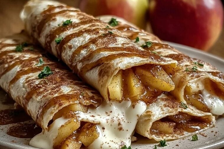 Lay a tortilla flat and spread cream cheese on one half (or sprinkle shredded cheddar if you’re going that route). Spoon the apple filling over the cheese, then fold the tortilla in half to seal.