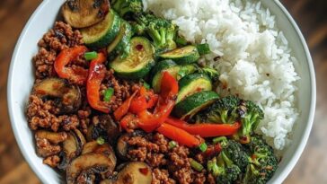 Spicy Ground Beef Stir-Fry Bowl with Garlic Veggies & Steamy Rice