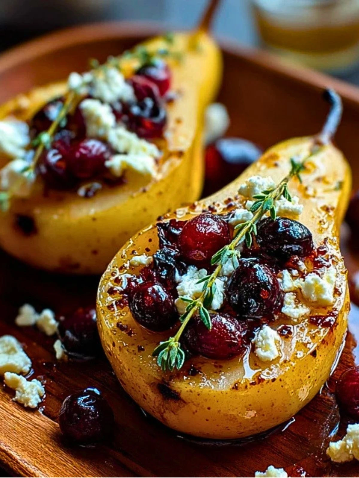 Top each pear half with crumbled feta and dried cranberries. If you are using chopped walnuts or pecans, scatter them over the top now. Add a few thyme leaves for a fresh savory note.