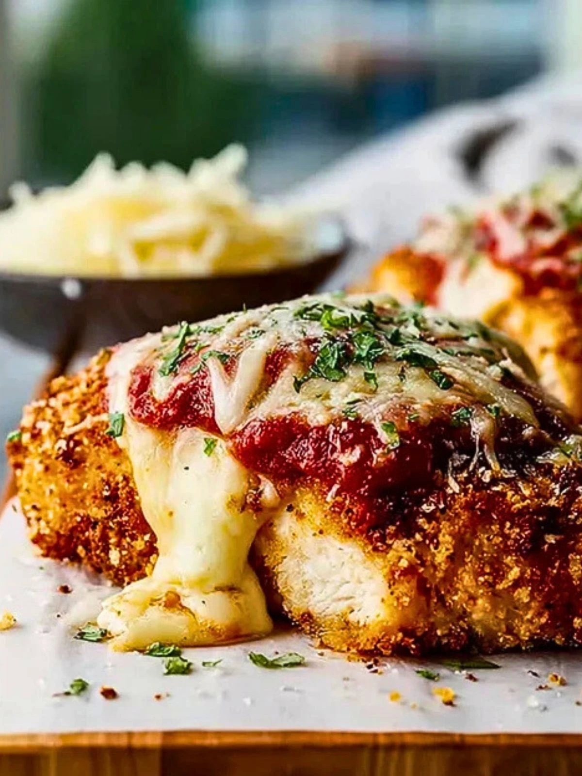 Preheat your oven to 425°F. Place the fried chicken breasts in a baking dish. Spoon marinara sauce over each piece, then top generously with shredded mozzarella and a sprinkle of extra Parmesan. Bake for 12 to 15 minutes, until the cheese is melted and bubbly.