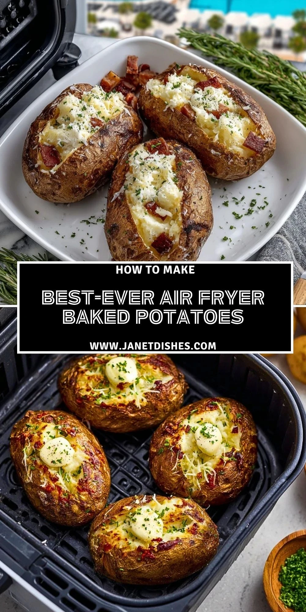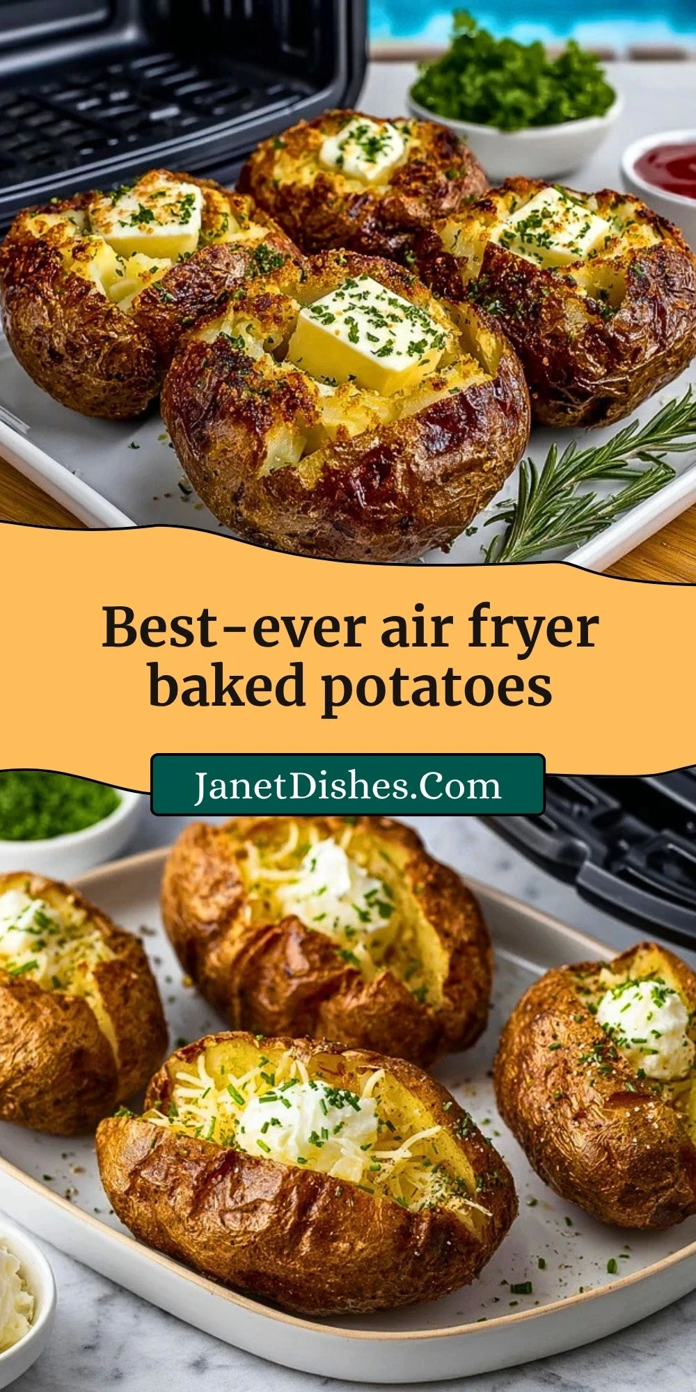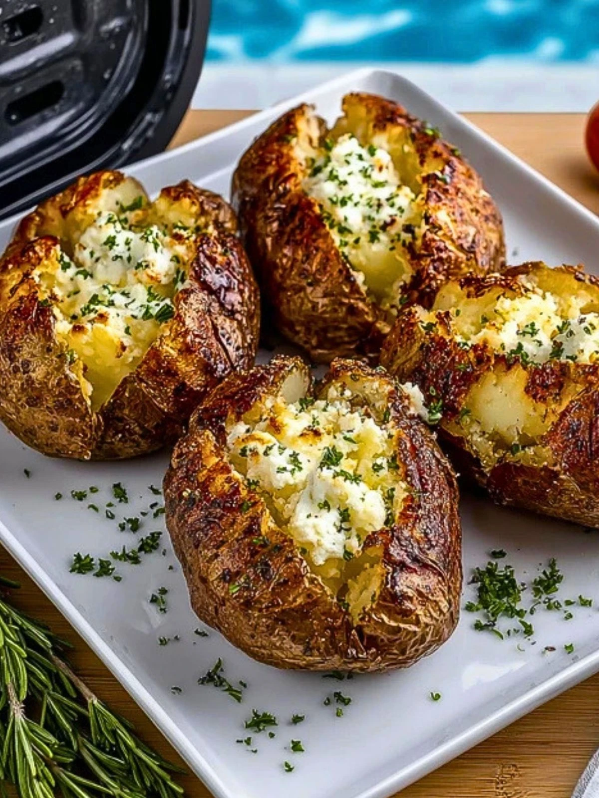 These baked potatoes are best served fresh out of the air fryer when the skins are crisp and the centers are steamy. They make an easy side dish or a meal on their own when stuffed with toppings. This recipe serves 4, making it perfect for a family dinner.