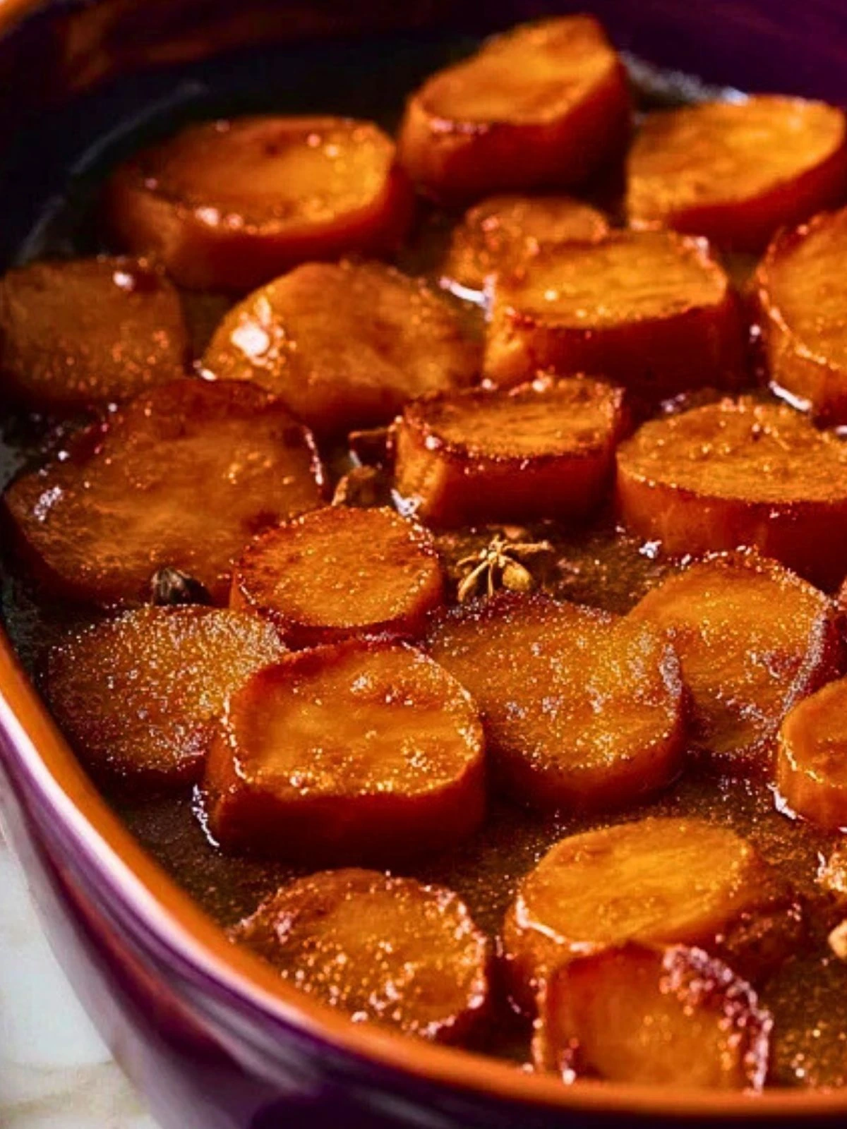 This recipe is all about indulgent flavors and melt-in-your-mouth texture. The sweet potatoes are slow-roasted until they’re perfectly tender, then coated in a syrupy brown sugar glaze infused with cinnamon, vanilla, and butter. It’s nostalgic, rich, and comforting.