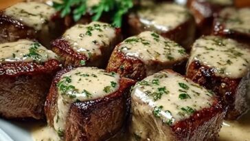 • Steak Bites with Garlic Butter and Creamy Parmesan Sauce