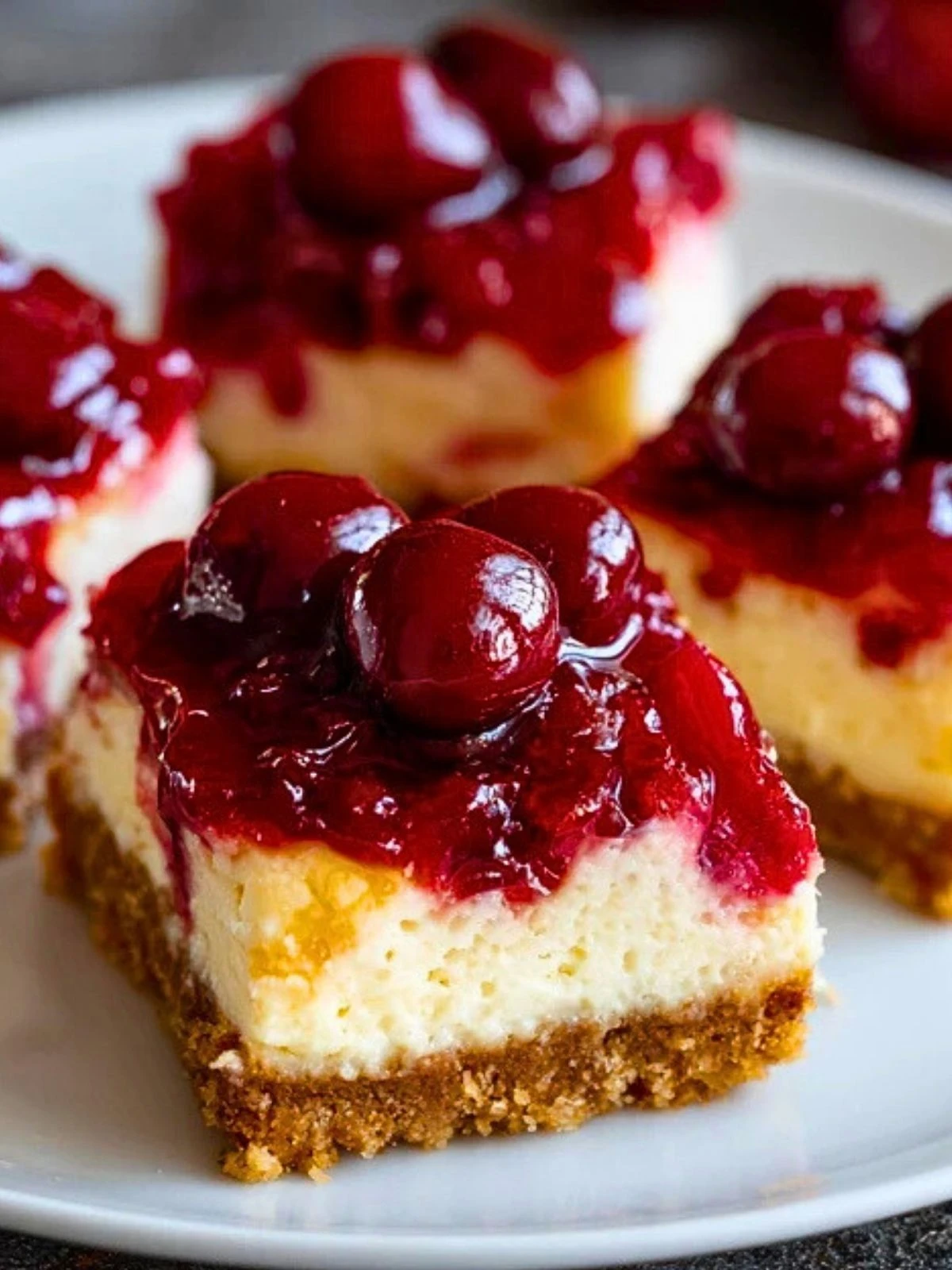 These Cherry Cheesecake Bars are the ultimate creamy dessert with a buttery graham cracker crust, smooth cheesecake filling, and luscious cherry pie topping. Perfect for holidays, potlucks, or everyday indulgence. Easy to make, slice, and store.