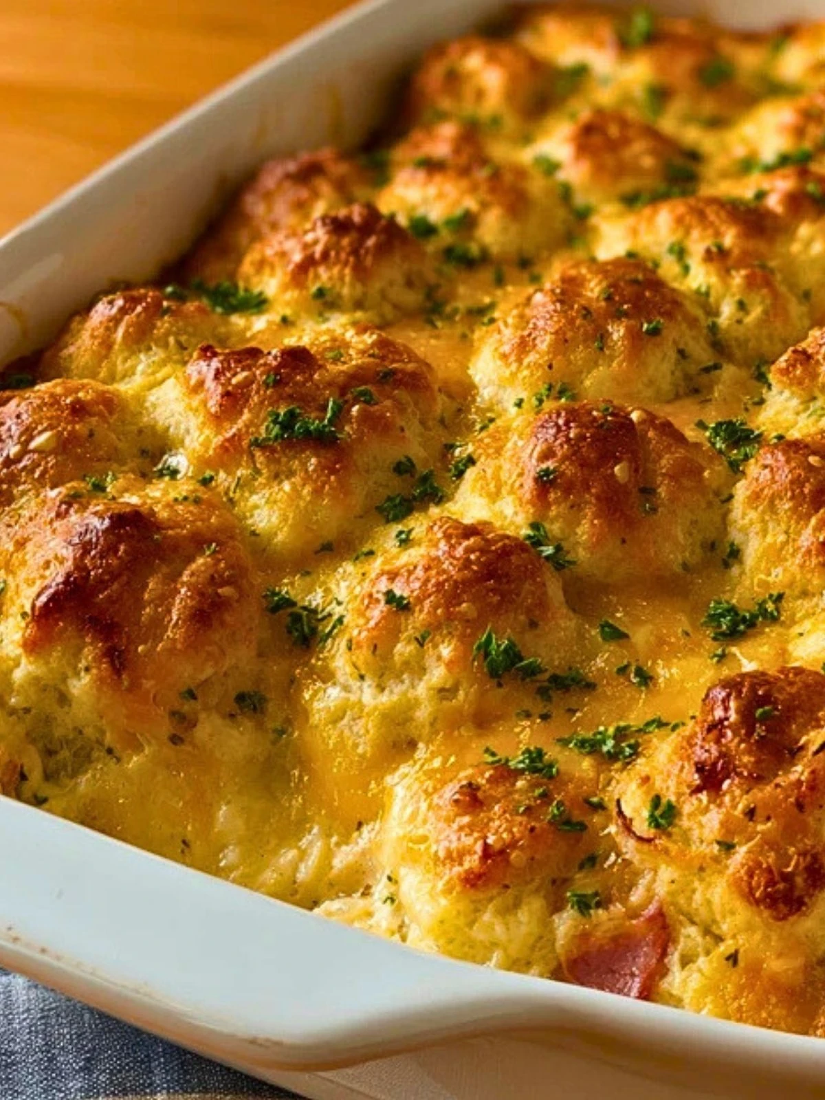 7. Bake uncovered for 35–40 minutes, or until the biscuits are puffed and golden brown.