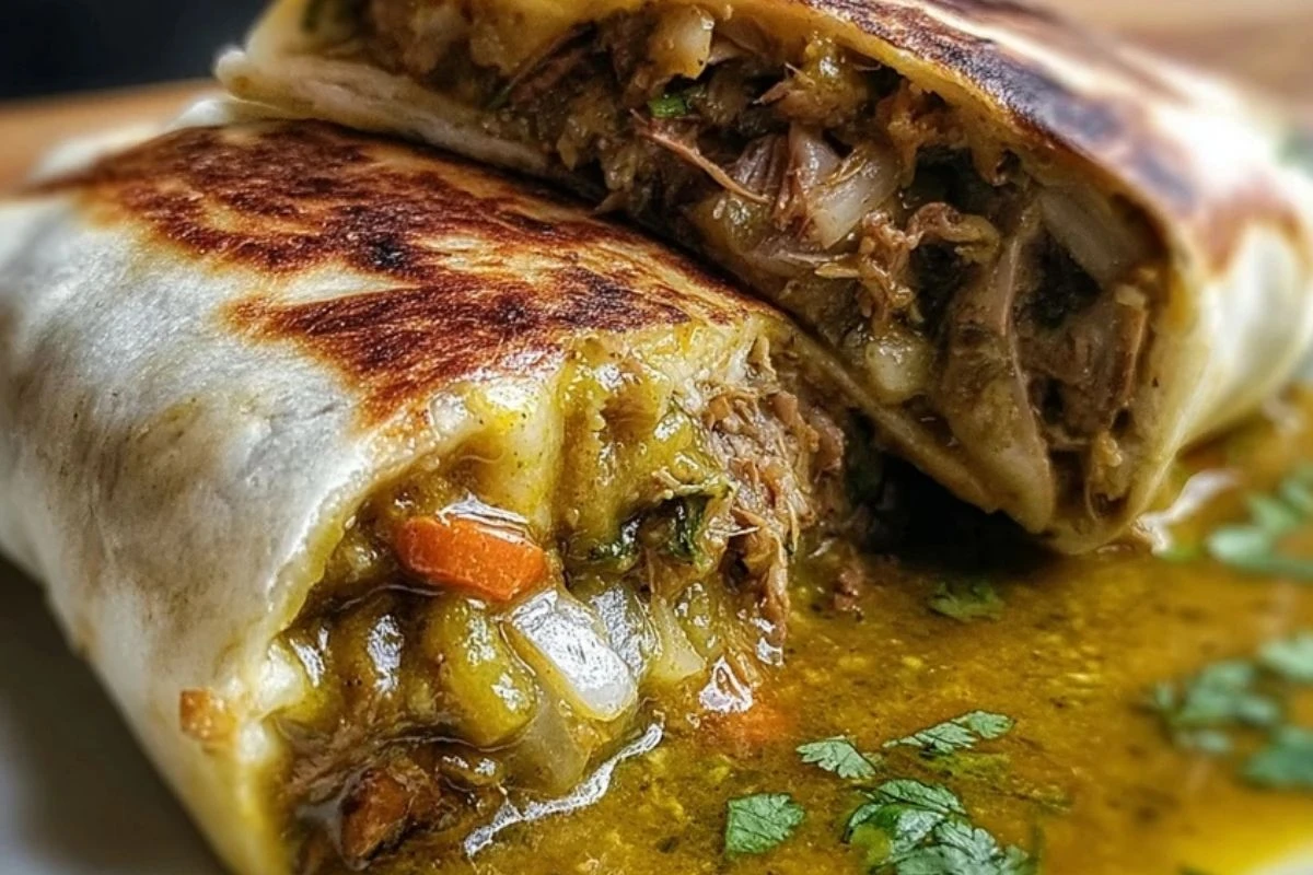 This Chili Verde Hatch Burritos recipe features tender pork simmered in a spicy tomatillo and Hatch chile sauce, wrapped in warm tortillas with beans, rice, and melted cheese. A flavorful and hearty Southwest-style burrito perfect for meal prep or family dinners.