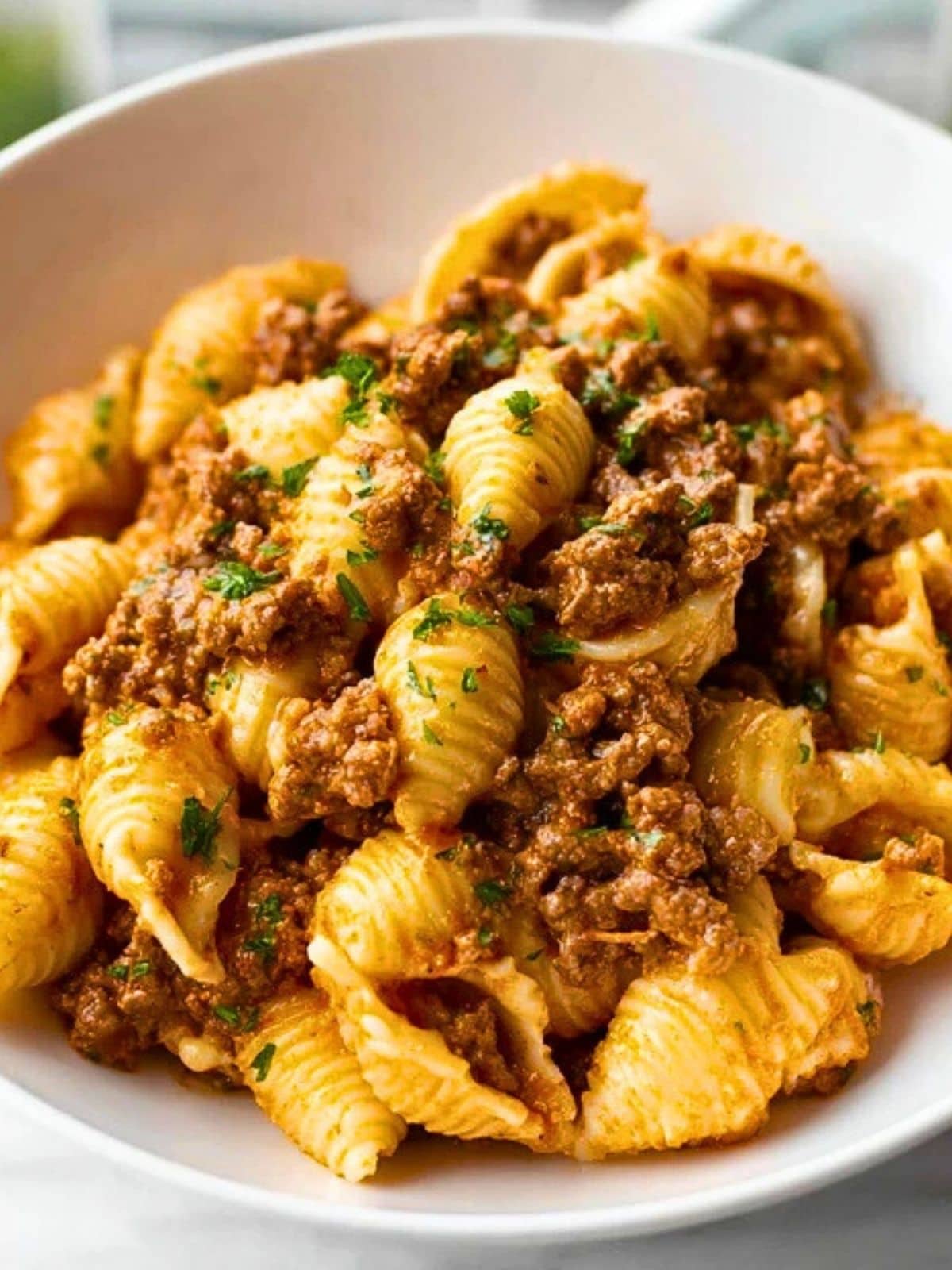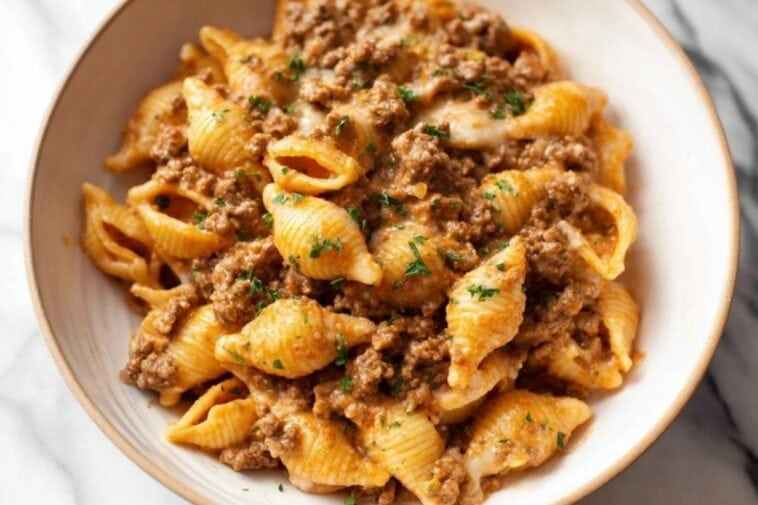Creamy beef and shells is best served fresh off the stove, when the sauce is silky and the pasta is just tender. It feeds about 4 people generously, especially when paired with a simple side or salad.