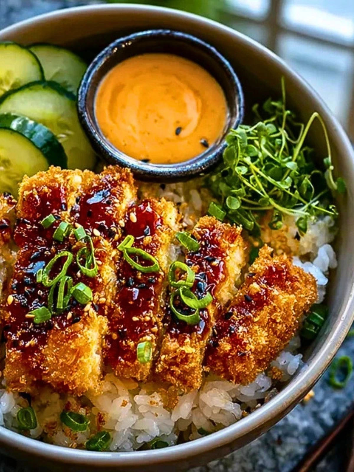 What makes these bowls so appealing is the mix of textures and bold flavor in every forkful. The crisp chicken, tender rice, cool vegetables, and sweet savory katsu sauce come together in a way that feels comforting without being too heavy. Once you make it at home, it quickly becomes one of those meals everyone asks for again.