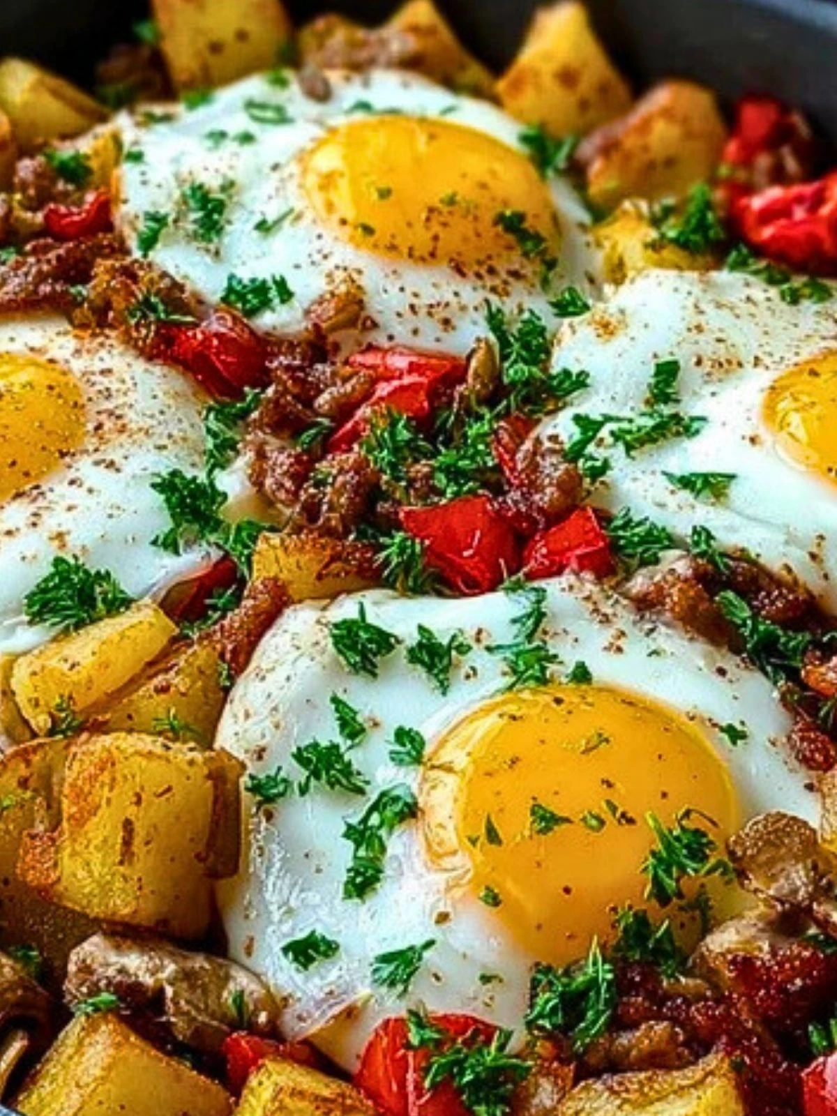 This recipe feeds about 4 hungry people or 6 if you’re serving it with other breakfast sides. Serve it straight from the skillet with a sprinkle of fresh herbs like parsley or chives. If you’re feeding a crowd, you can keep it warm in the oven at low heat until ready.
