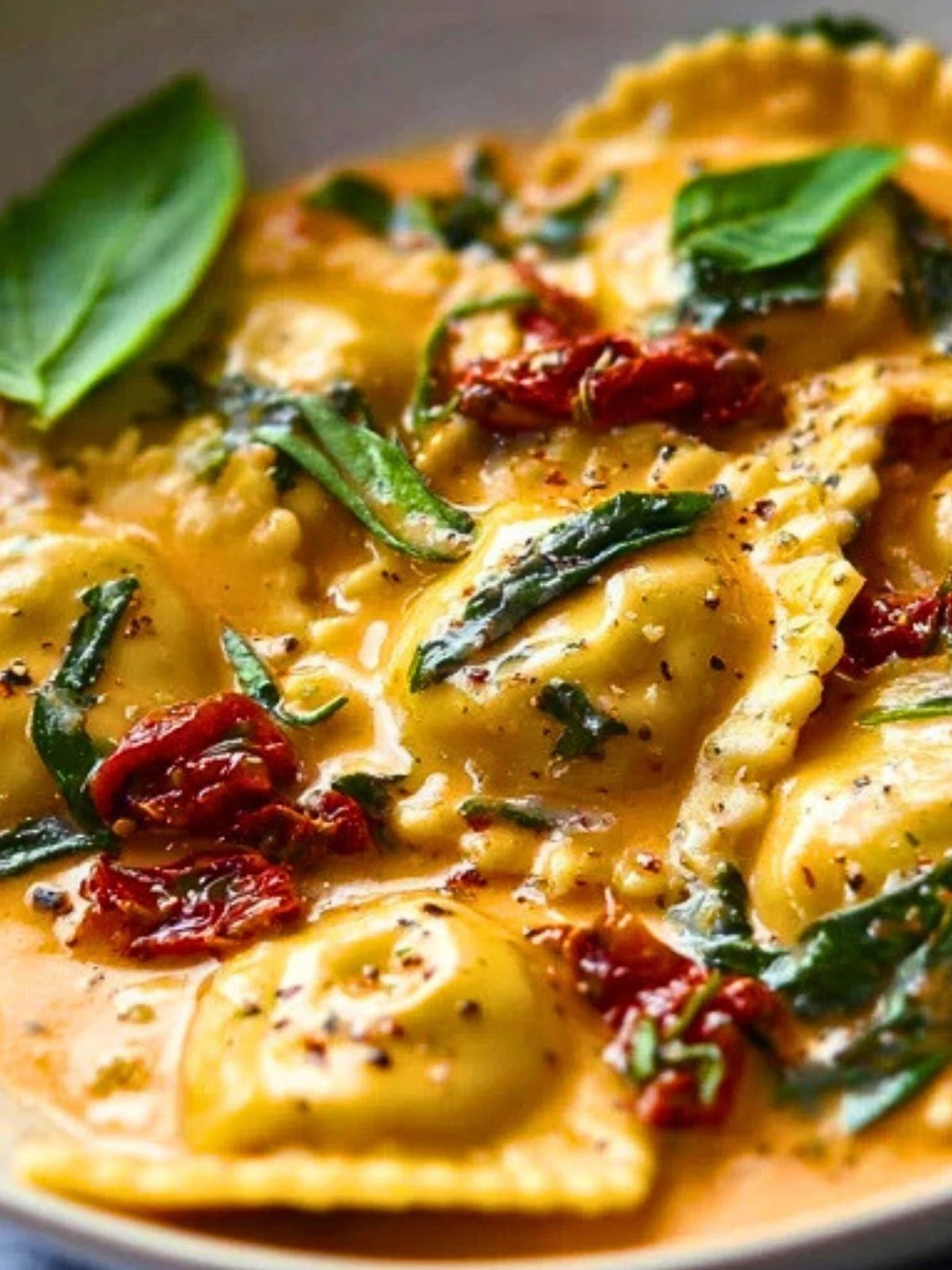 This Dreamy Creamy Tuscan Ravioli is the ultimate comfort food dinner made with cheese ravioli, sun-dried tomatoes, spinach, and a rich parmesan cream sauce. This easy one-pan meal is perfect for weeknights and packed with classic Tuscan flavors.