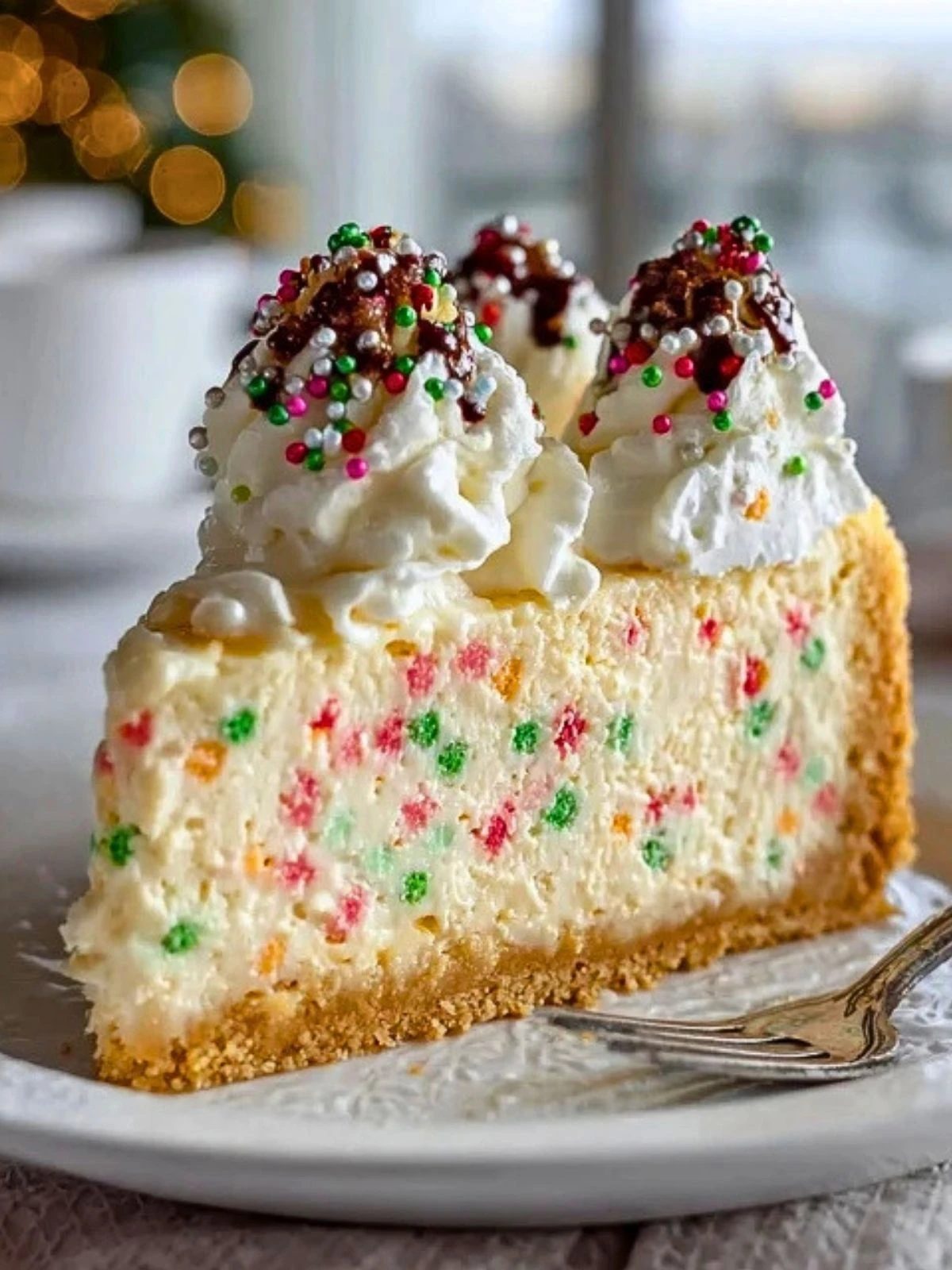 Scatter sprinkles over the top if you want a colorful, party-ready look. This is the easiest way to make the cheesecake feel festive for birthdays, showers, or holiday dessert tables.