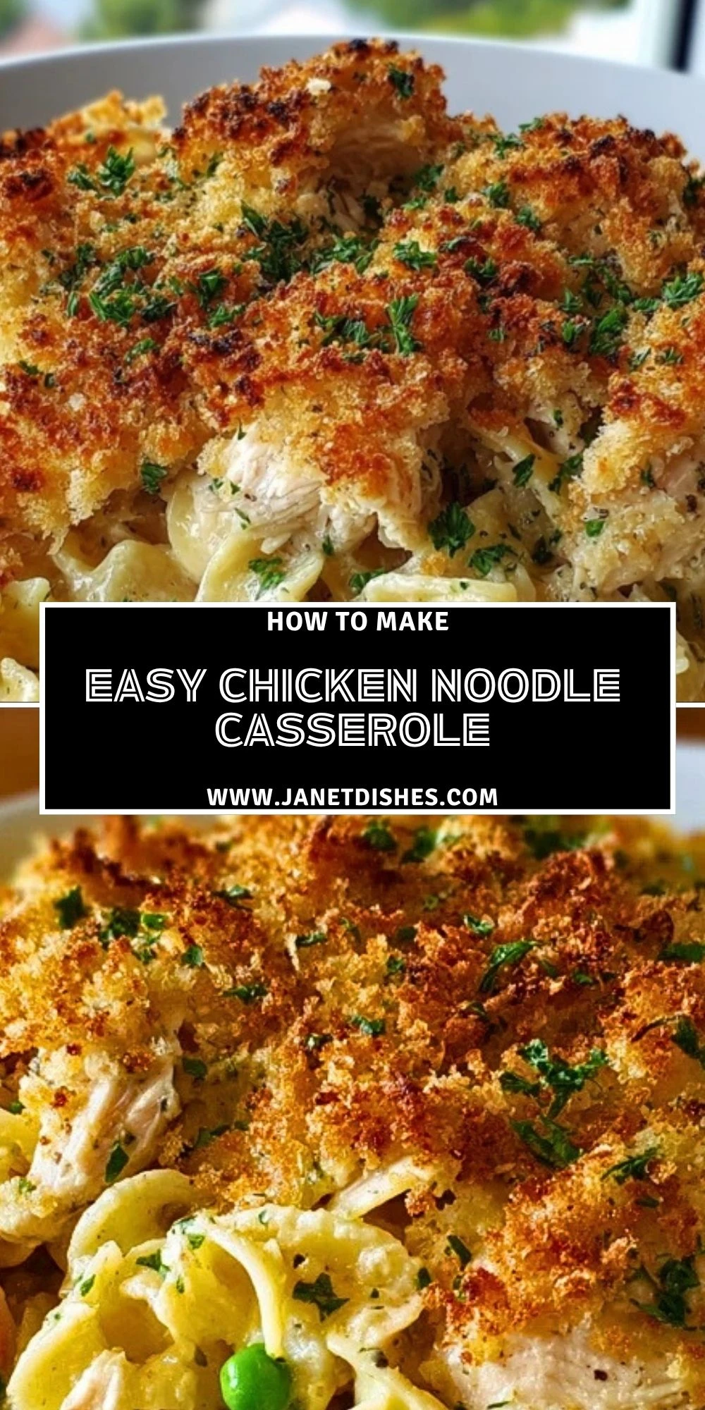 Easy Chicken Noodle Casserole comfortably feeds about 6 people, which makes it a great choice for a family meal or for stretching into leftovers the next day. Serve it hot straight from the oven when the sauce is still creamy and the top is perfectly melted. A little chopped parsley on top can freshen it up, but it is just as good served simply.
