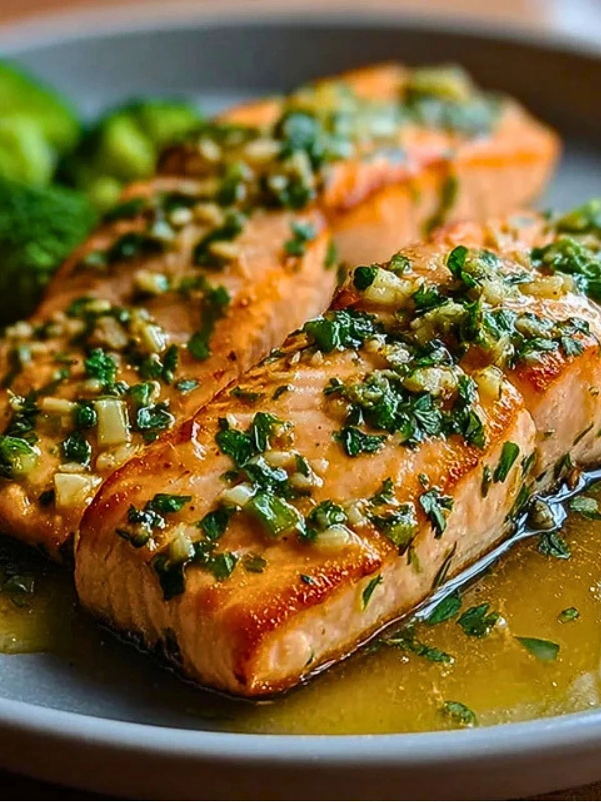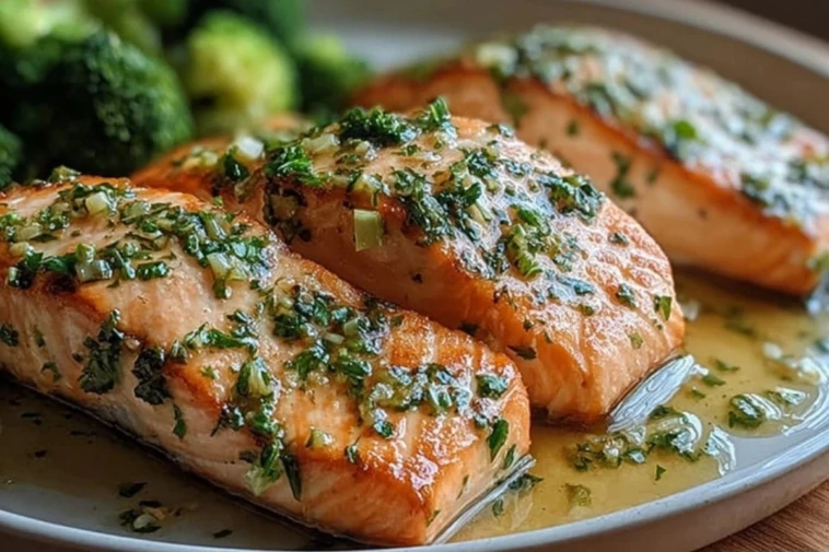 Sprinkle chopped fresh parsley over the salmon right before serving. Spoon any buttery juices from the baking dish over the top for even more flavor.