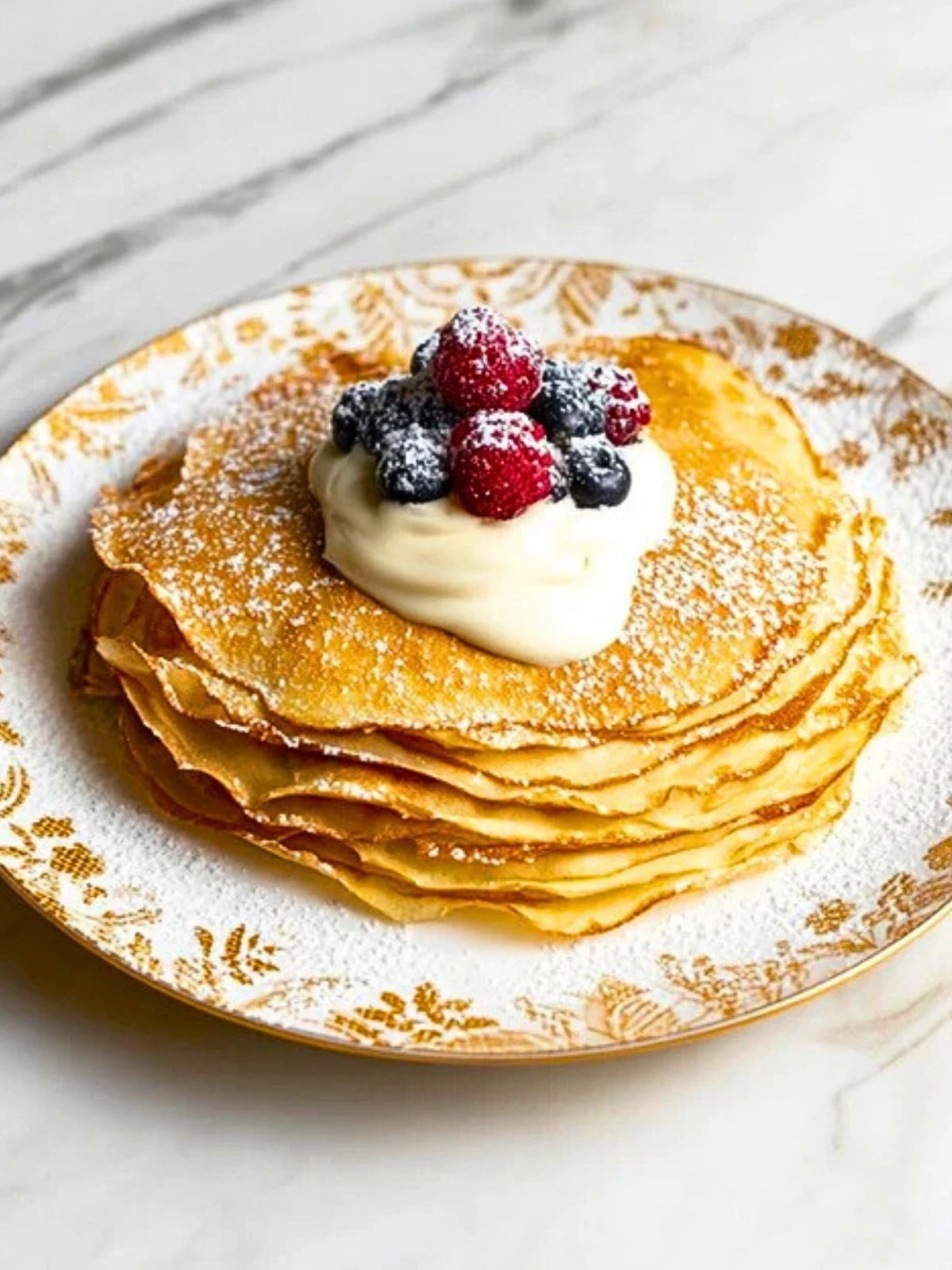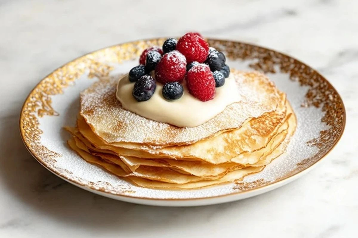 Add your desired fillings—whipped cream, spiced cream cheese, fruit preserves, or mascarpone all work well. Fold or roll the crêpes and top with powdered sugar, syrup, or berries.