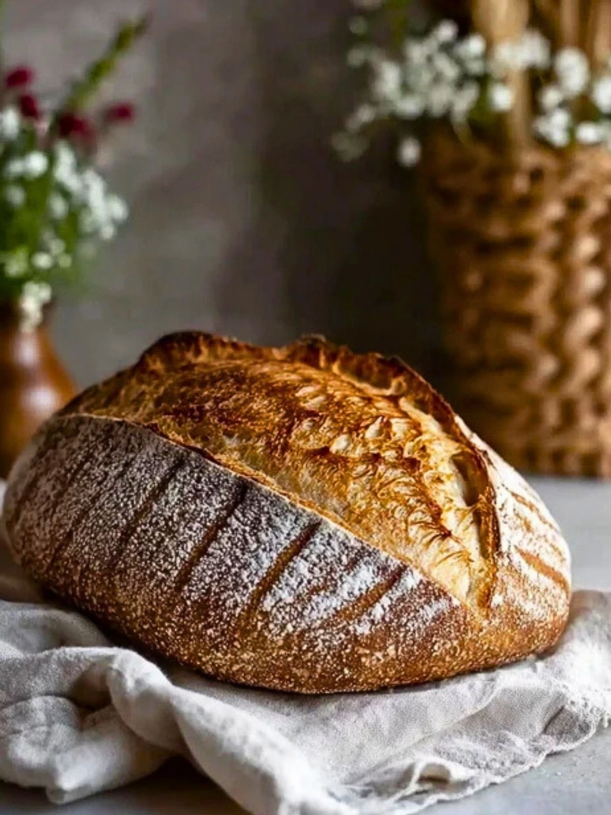 Preheat your oven with a Dutch oven inside to 475°F (245°C). Score the top of your loaf and bake covered for 20 minutes, then uncovered for 25 minutes until golden brown.