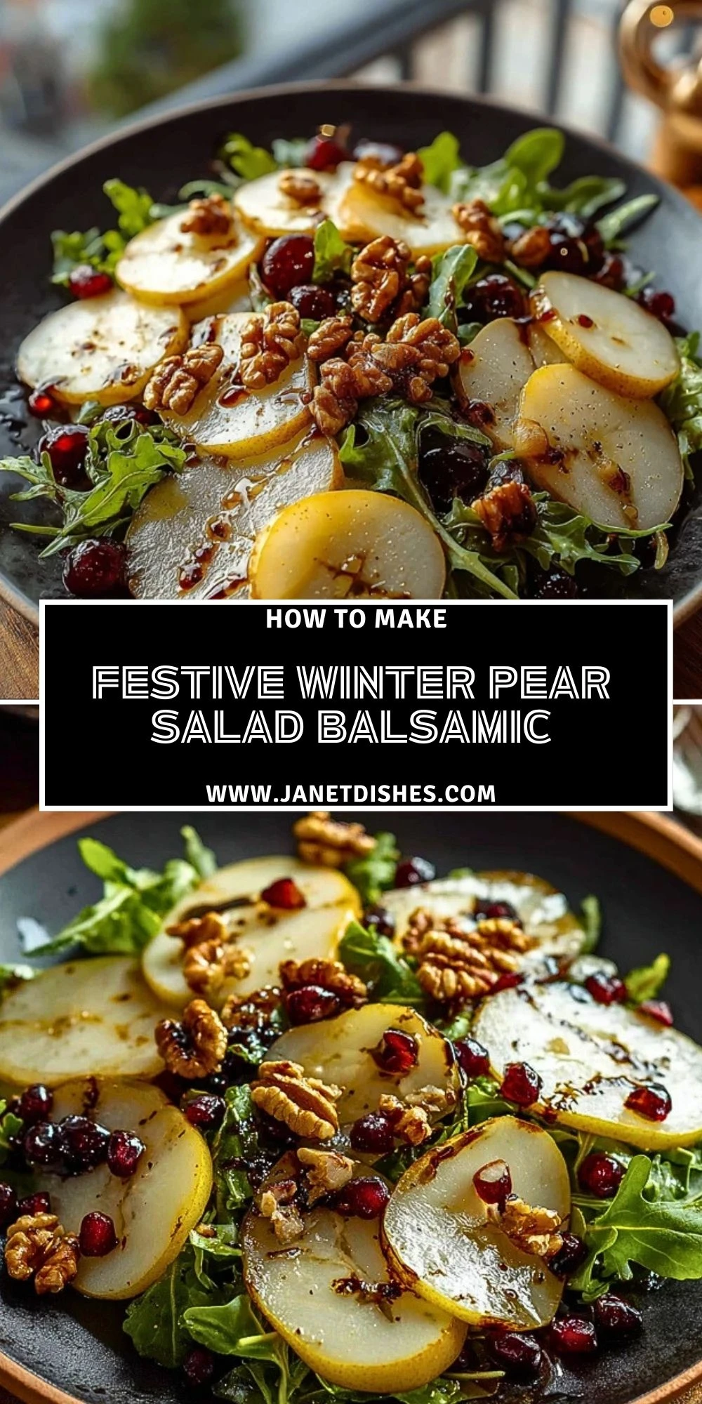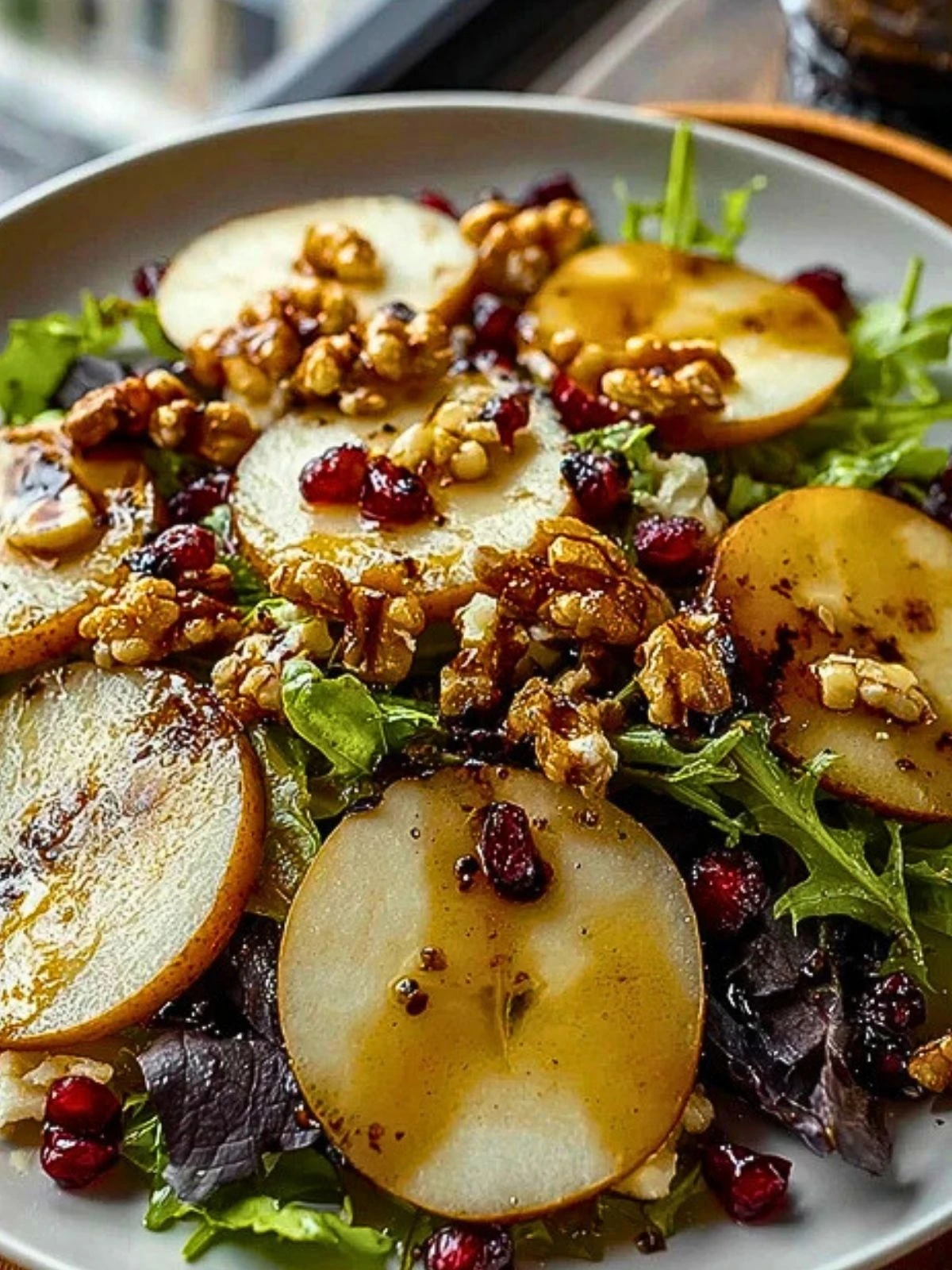 A festive winter pear salad with balsamic that brings together juicy pears, arugula, creamy goat cheese, crunchy walnuts, and a tangy-sweet balsamic glaze. This elegant yet easy salad is perfect for holiday dinners, cozy winter meals, or as a refreshing contrast to heavier mains. A delicious seasonal salad with pears that celebrates color, flavor, and texture.