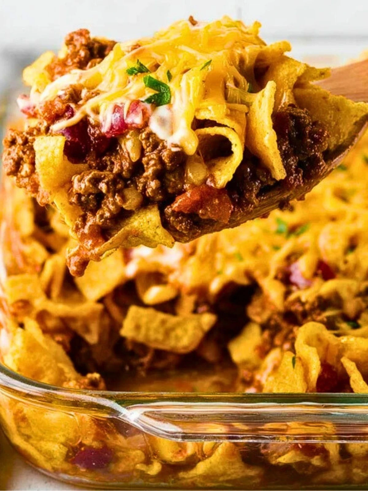 Traditionally made by opening a bag of Fritos and pouring chili right on top, this recipe elevates the classic version into something you can proudly serve straight from the oven. Think layers of seasoned ground beef, rich chili beans, melty cheese, and of course, those iconic corn chips that keep their crunch under a gooey layer of cheddar.
