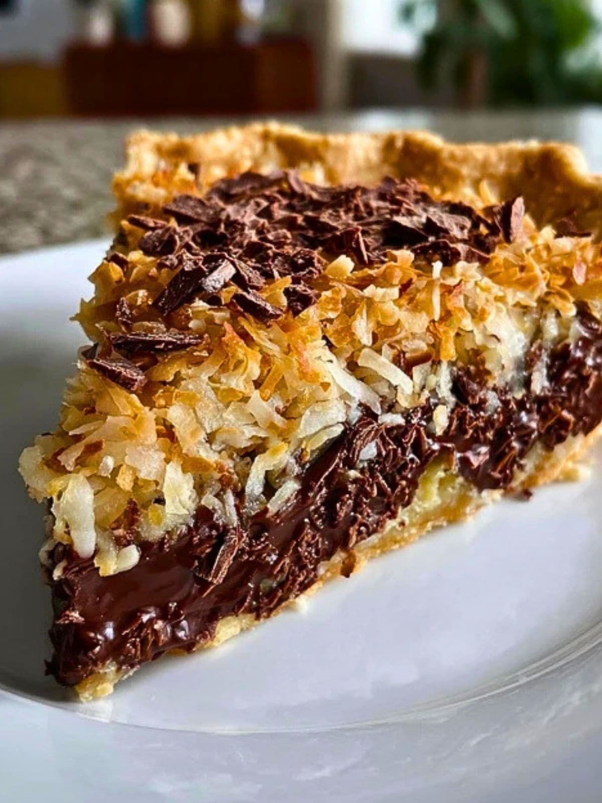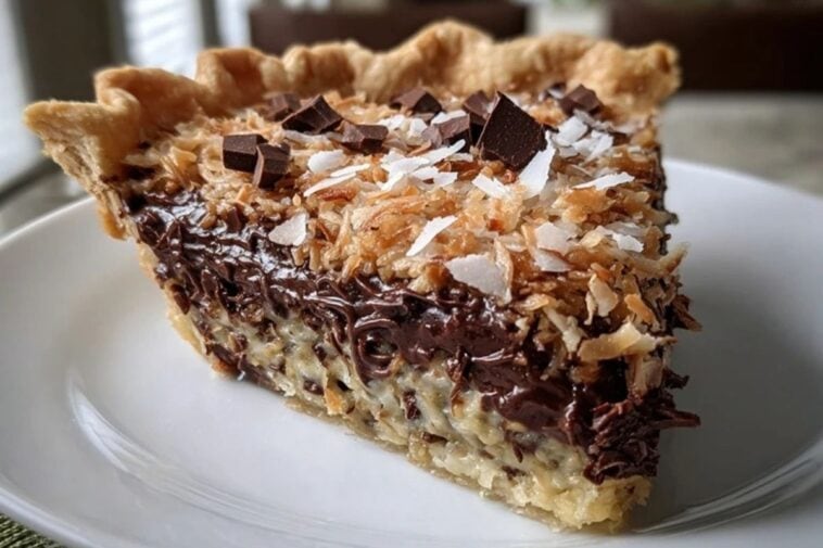 This pie is a dessert lover’s fantasy: chocolatey, nutty, rich, and textured. The chocolate filling is silky smooth with a deep cocoa base, while the topping delivers sweet crunch and chew from coconut and pecans. Together, it makes every slice decadent yet balanced. Plus, it uses simple ingredients you likely already have, and you don’t need to be a pro baker to get it just right. It’s a bake-once, wow-always kind of pie.