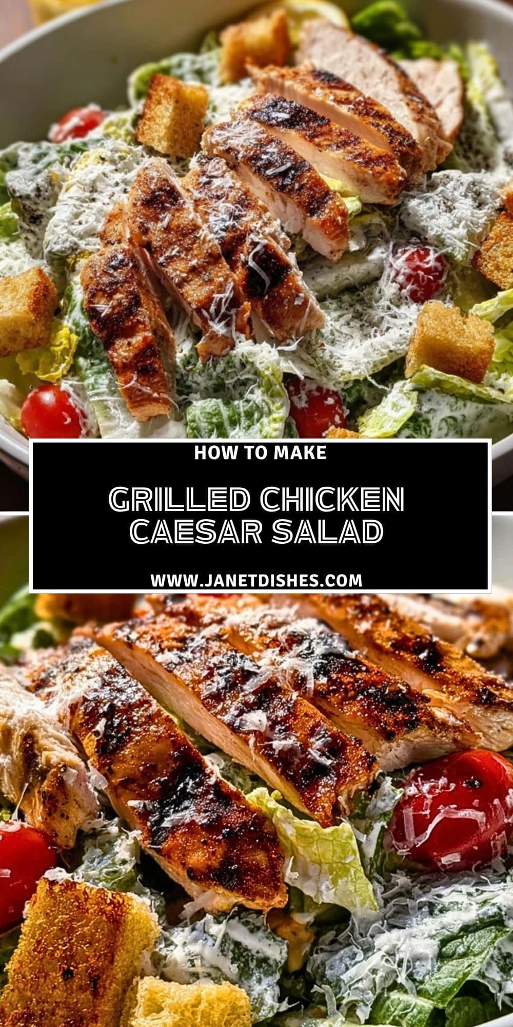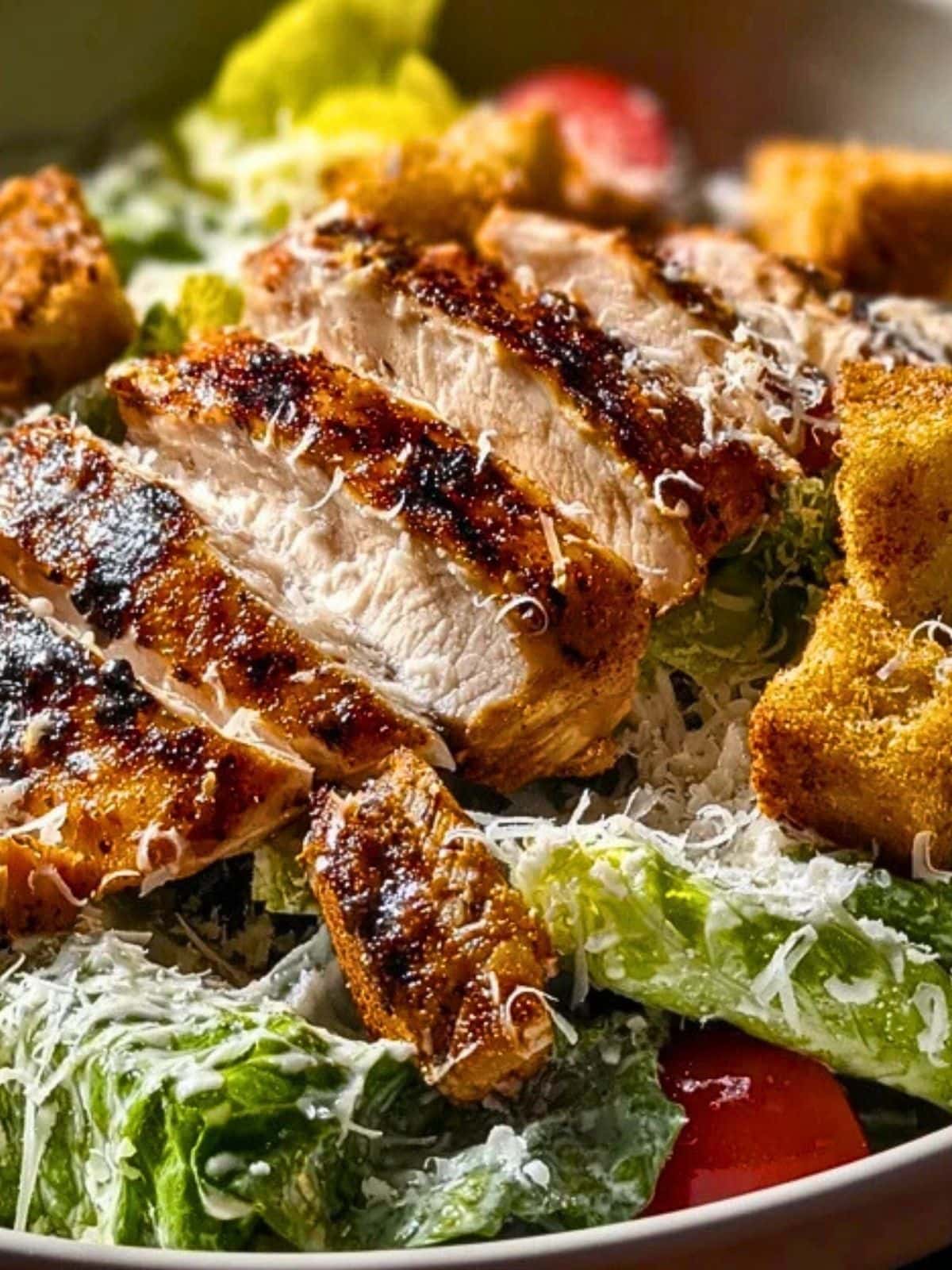 8. Add grilled chicken slices, croutons, and extra Parmesan. Serve immediately.