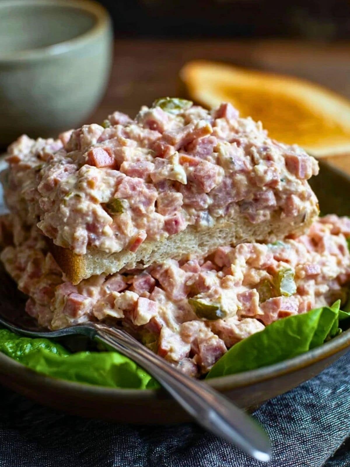 Warm, slightly crispy bread adds a comforting base to scoop or sandwich the ham salad.