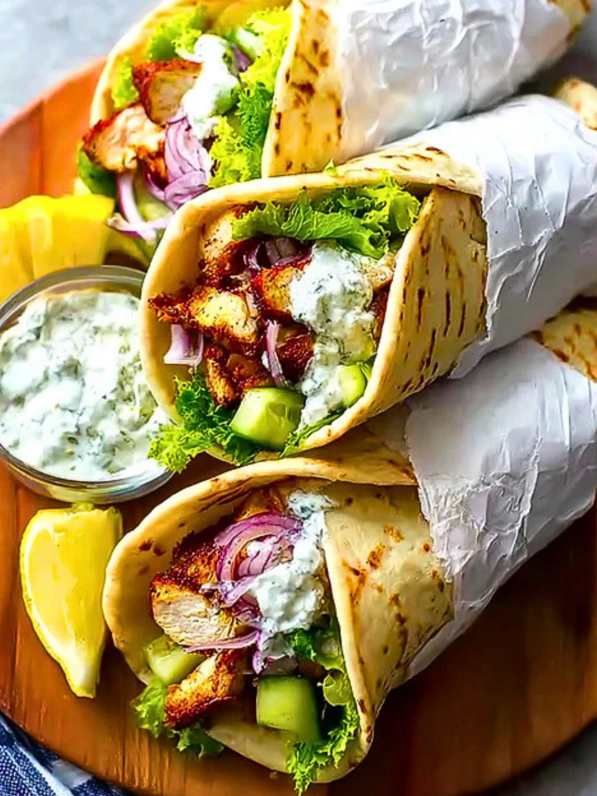 They come together quickly and require simple ingredients you can prep ahead. The chicken is marinated in classic Mediterranean herbs, giving it a deep, savory flavor that pairs perfectly with creamy yogurt-based sauces and crisp vegetables. These wraps are healthy, portable, and endlessly versatile. It’s everything you want in a weeknight meal or picnic lunch.