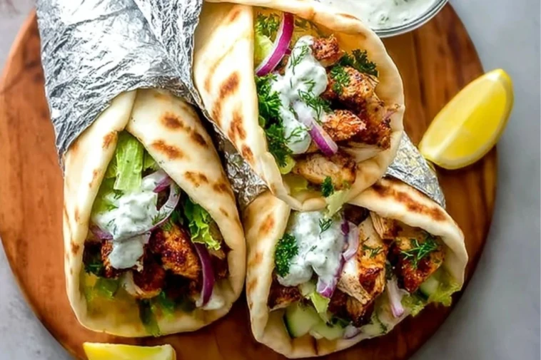 They come together quickly and require simple ingredients you can prep ahead. The chicken is marinated in classic Mediterranean herbs, giving it a deep, savory flavor that pairs perfectly with creamy yogurt-based sauces and crisp vegetables. These wraps are healthy, portable, and endlessly versatile. It’s everything you want in a weeknight meal or picnic lunch.