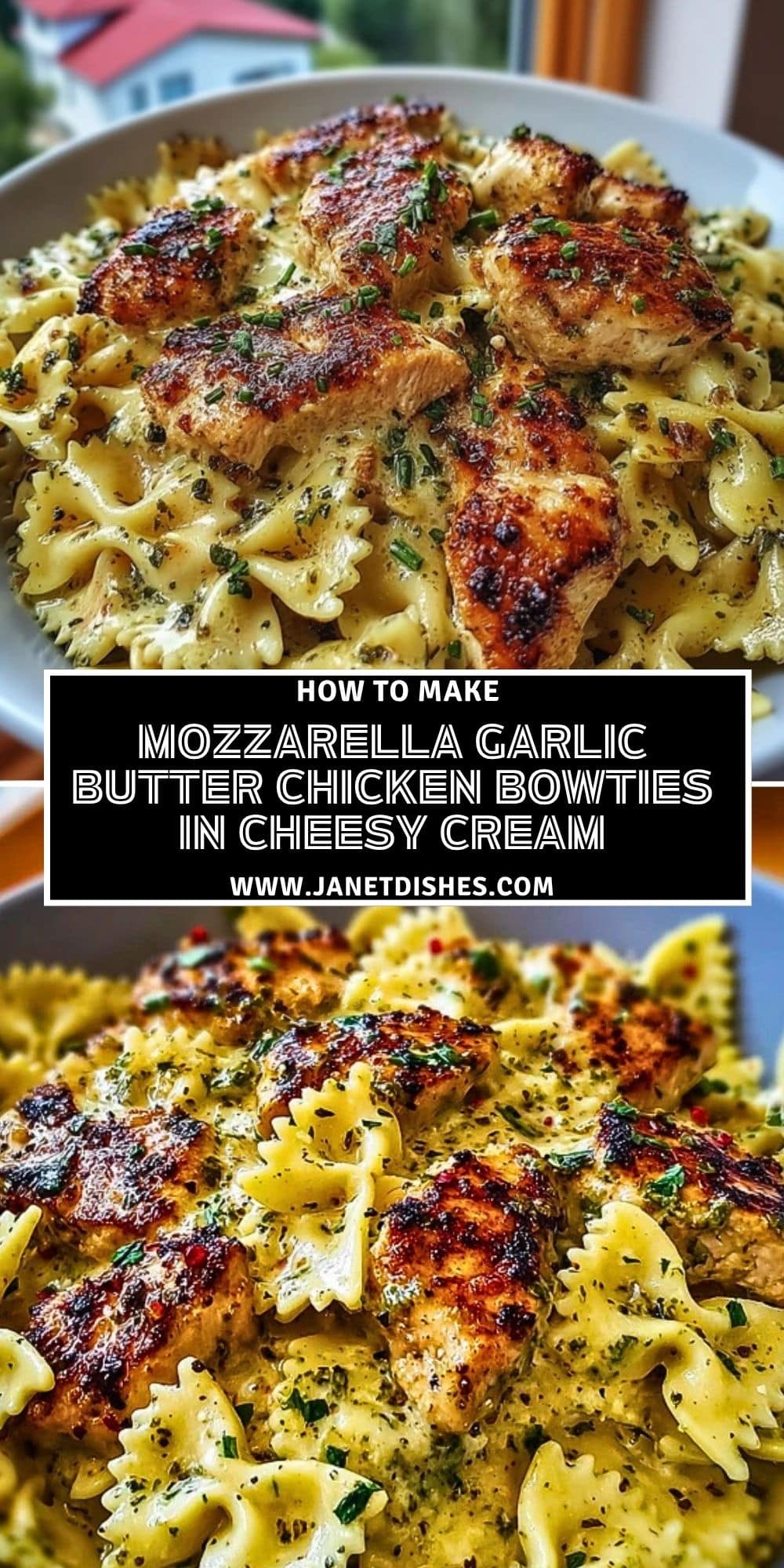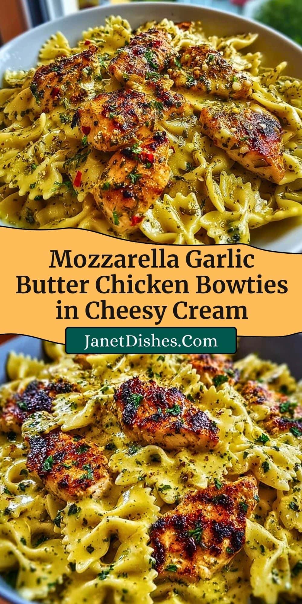 This Mozzarella Garlic Butter Chicken Bowties in Cheesy Cream recipe features tender chicken, garlic butter, and gooey mozzarella tossed with bowtie pasta in a rich cream sauce. Perfect for cozy dinners or family meals, it’s a cheesy pasta dish that delivers comfort and flavor in every bite. Easy, creamy, and irresistibly delicious!