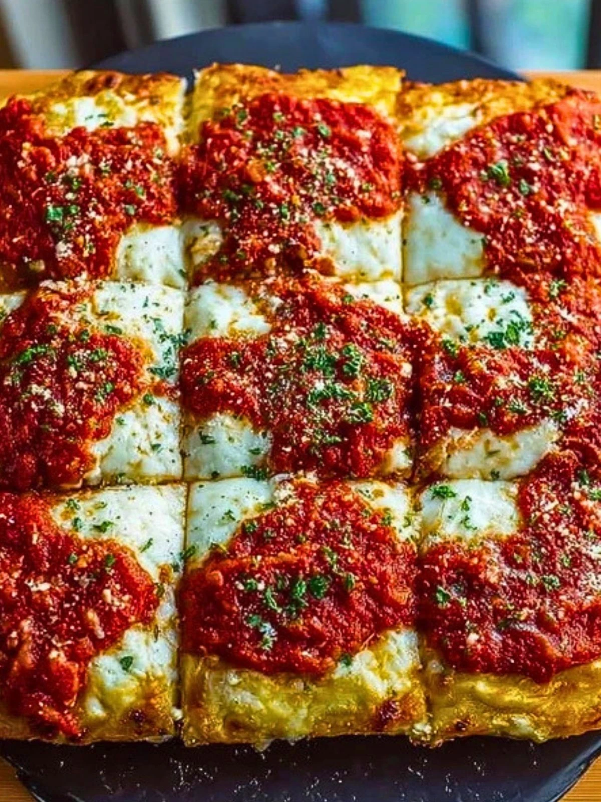 This pizza has everything people love about a great pan pizza, but with a lighter, more delicate texture than you might expect. The crust rises beautifully and bakes into thick squares with a tender interior and a crisp, chewy base. It also holds toppings well, so every slice feels hearty without turning soggy.