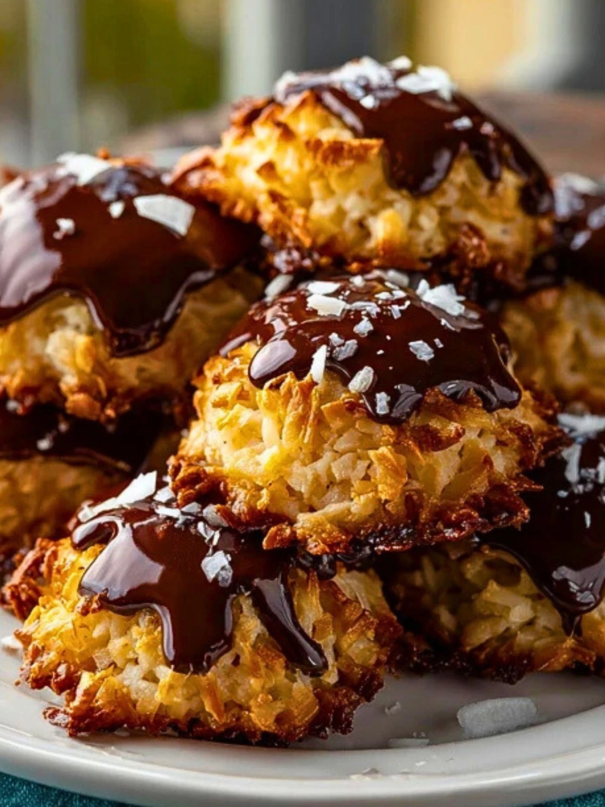 The base is a simple mixture of toasty coconut and gooey caramel, shaped into perfect rounds and finished off with a generous drizzle of chocolate. These are the kind of cookies that taste like you spent hours baking, but really only take 15 minutes of hands-on time. They’re a perfect make-ahead treat for parties, holiday platters, or just a little midweek indulgence.