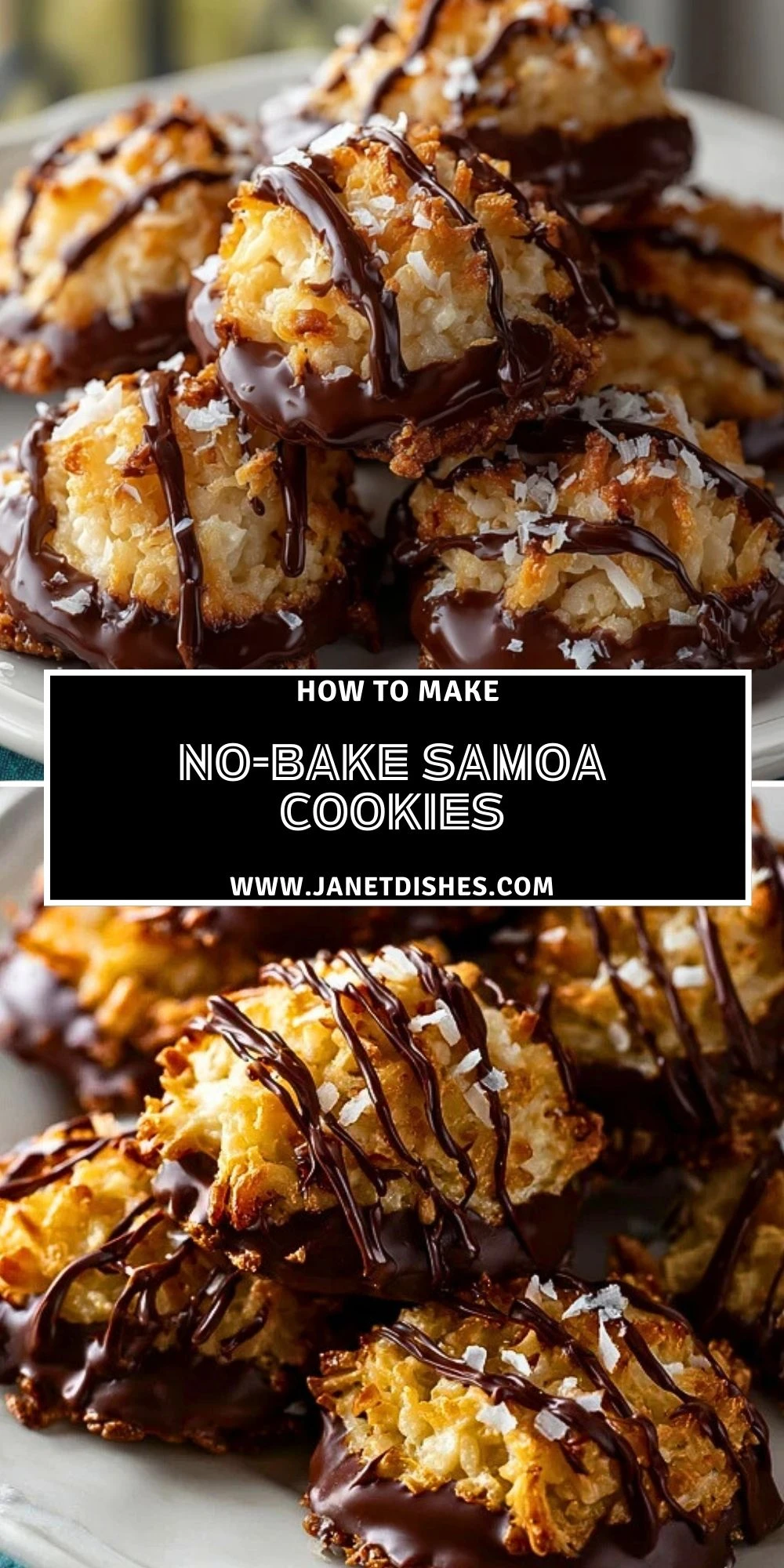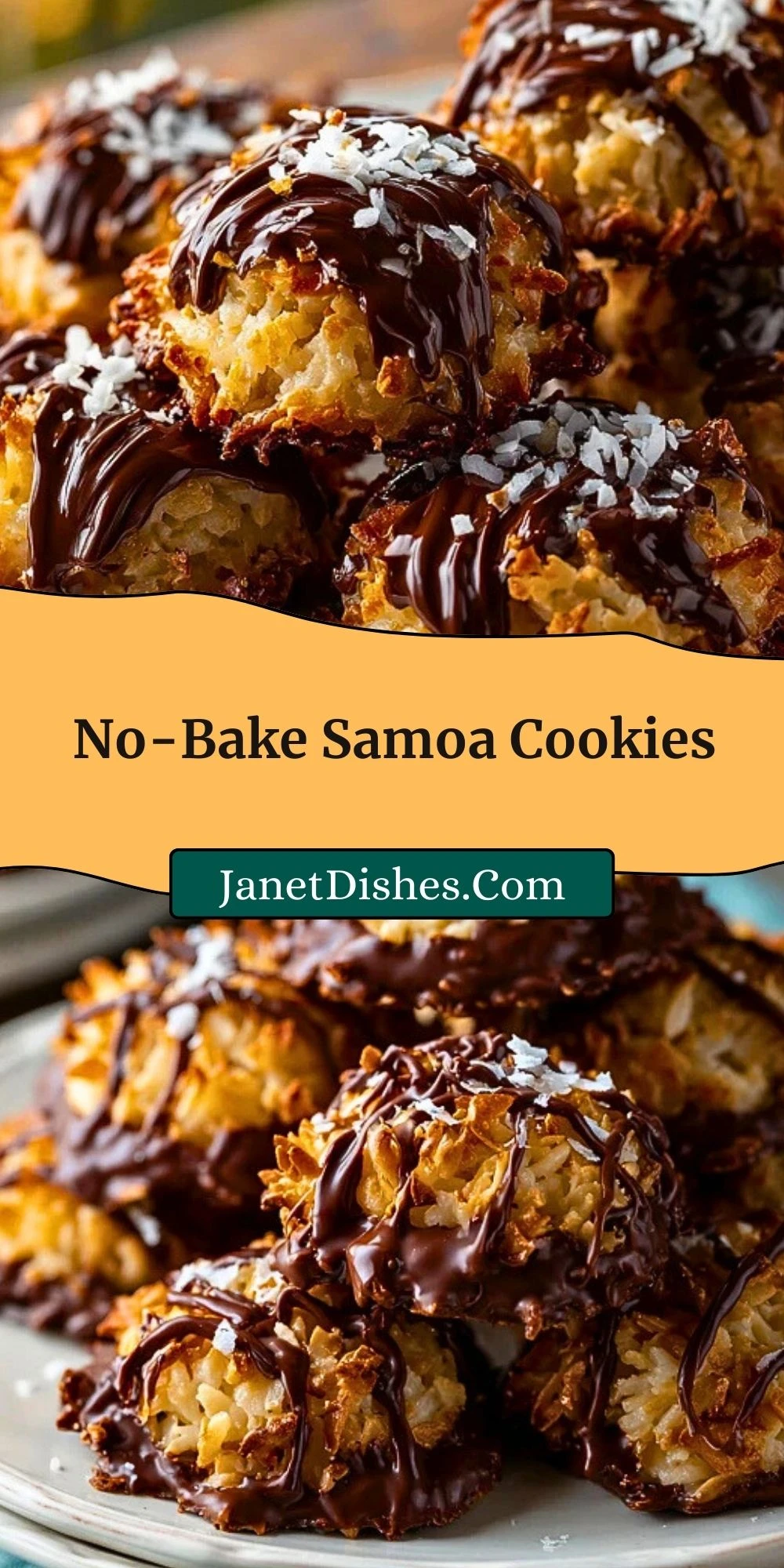 These No-Bake Samoa Cookies are a quick and easy twist on the classic Girl Scout favorite, featuring toasted coconut, gooey caramel, and rich chocolate. Perfect for a no-bake dessert, cookie swap, or sweet gift idea. Keywords: no-bake cookies, Samoa cookies, coconut caramel chocolate cookies.
