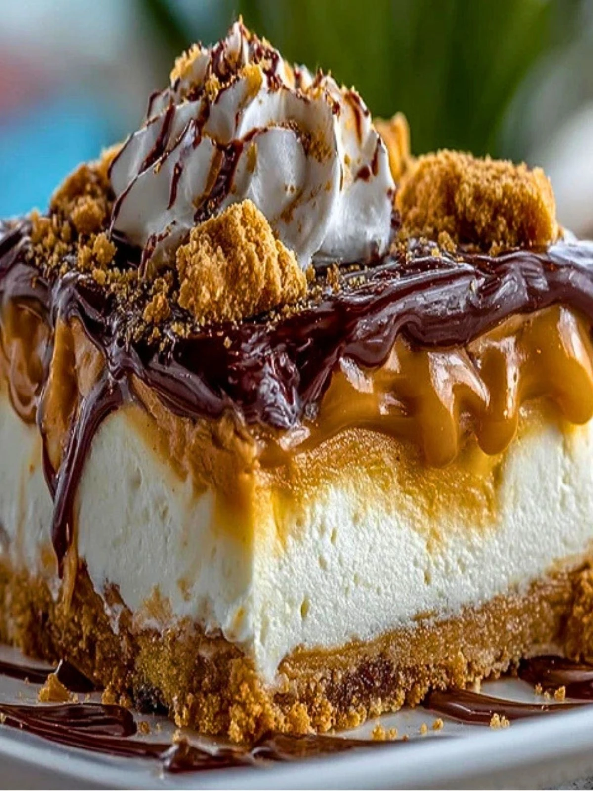 This dessert checks all the right boxes. It is easy to make ahead, simple to slice, and full of familiar flavors that always go over well. You get the comfort of peanut butter, the softness of a creamy filling, and the little extra indulgence that comes from a chilled layered dessert.