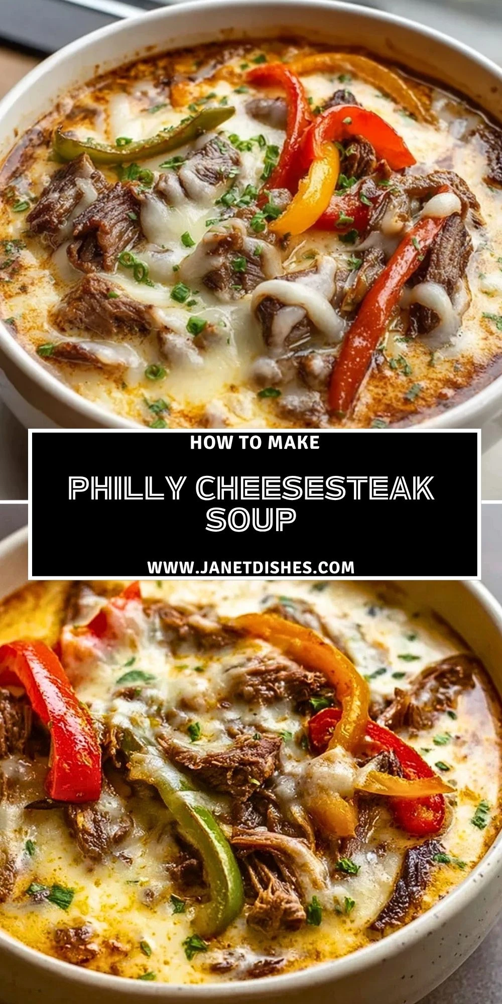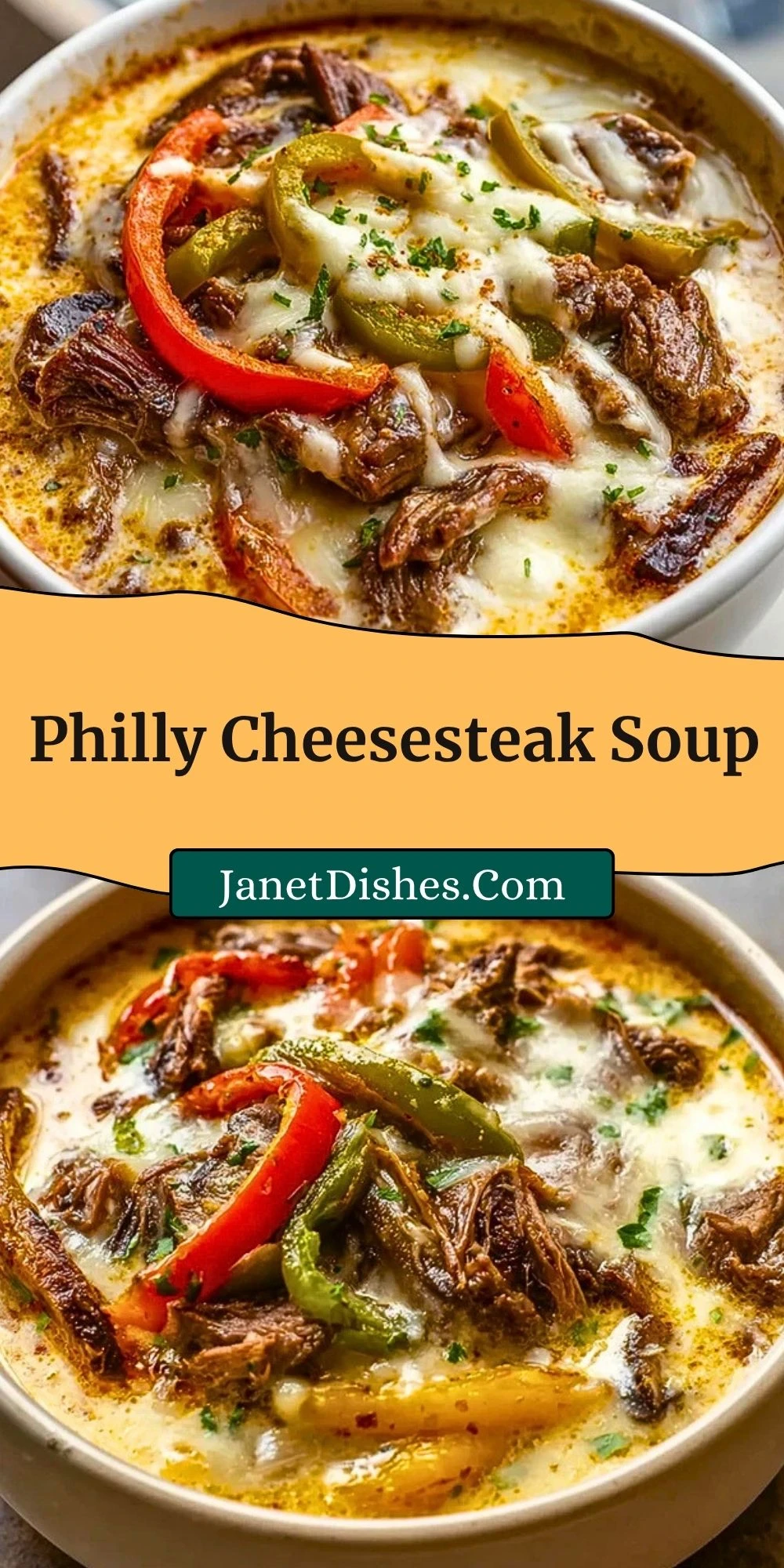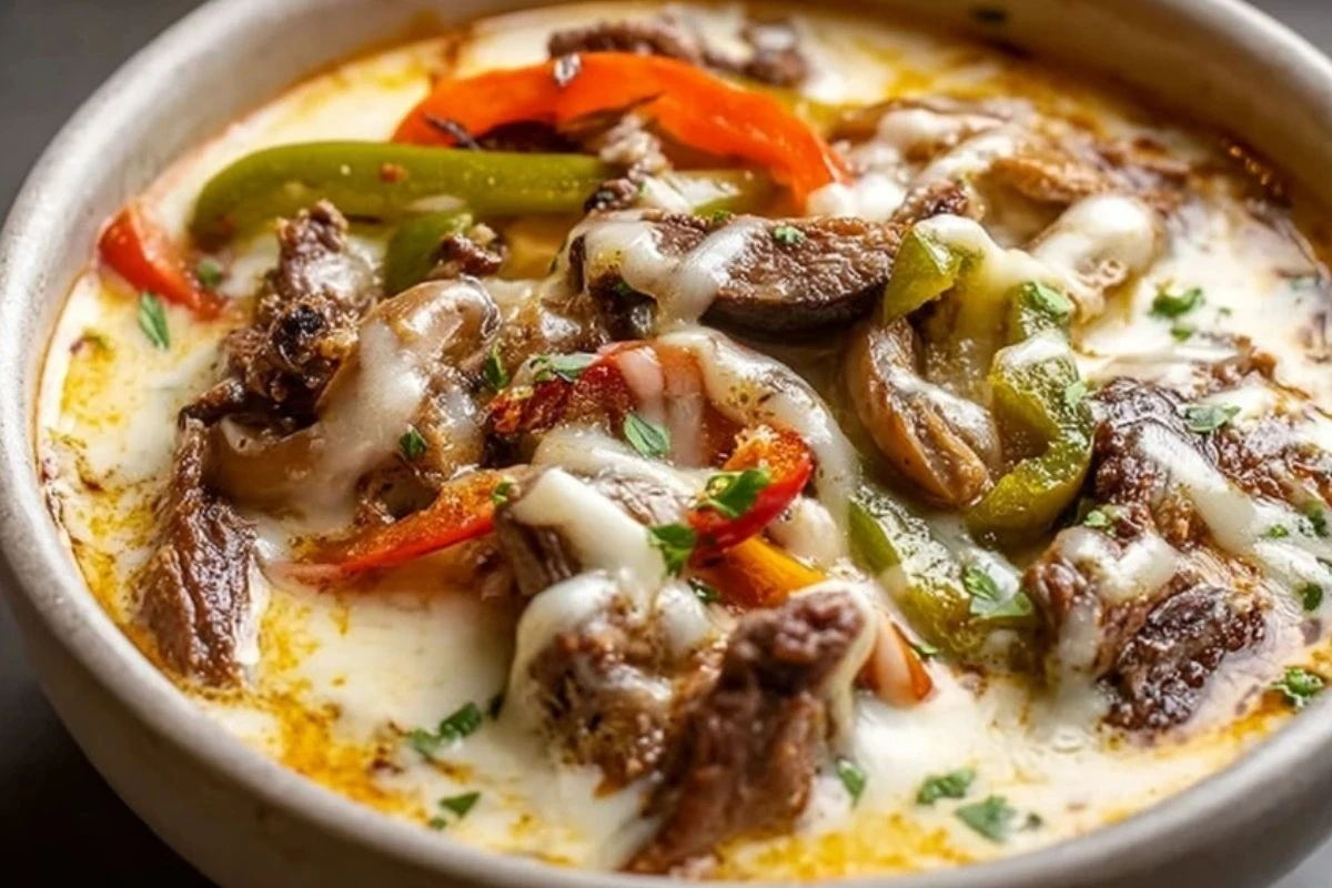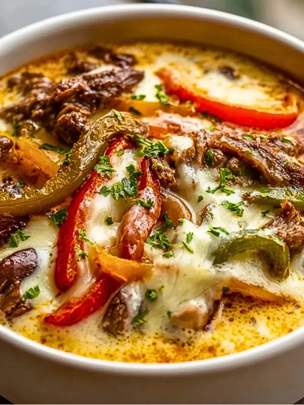 Philly Cheesesteak Soup is a creamy, cheesy, and savory soup recipe packed with thinly sliced ribeye steak, bell peppers, onions, and provolone cheese. This easy weeknight dinner idea delivers all the flavor of a cheesesteak sandwich in comforting soup form. Perfect for chilly nights and family meals.