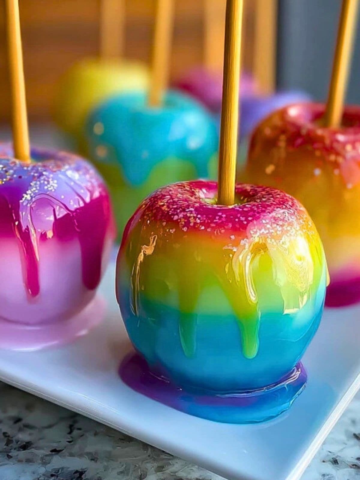 Rainbow Candy Apples are best enjoyed the day they’re made, when the shell is crisp and glossy. That said, they can be made a day ahead and stored in a cool, dry place. Avoid humid environments or the refrigerator, which can cause the coating to sweat.