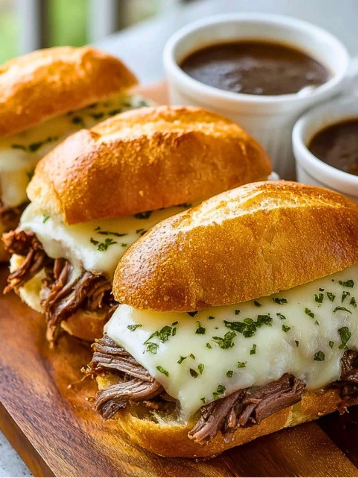 9. Serve hot with a small bowl of au jus on the side for dipping.