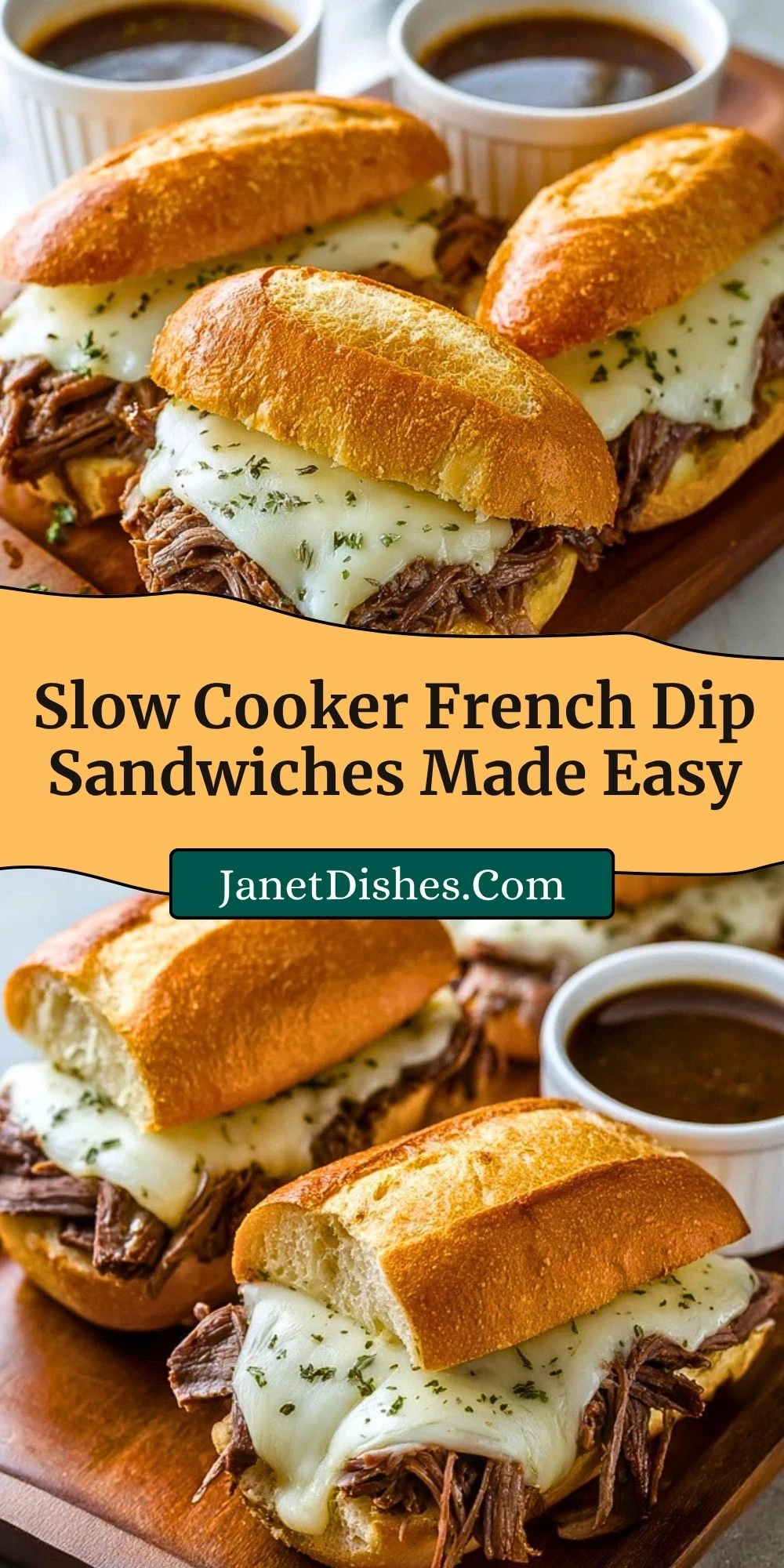 Slow Cooker French Dip Sandwiches are the ultimate comfort food. Made with tender chuck roast, rich beef broth, melted provolone, and crusty hoagie rolls, this slow cooker meal is juicy, flavorful, and effortless. A perfect weeknight dinner or game day favorite with savory au jus for dipping.