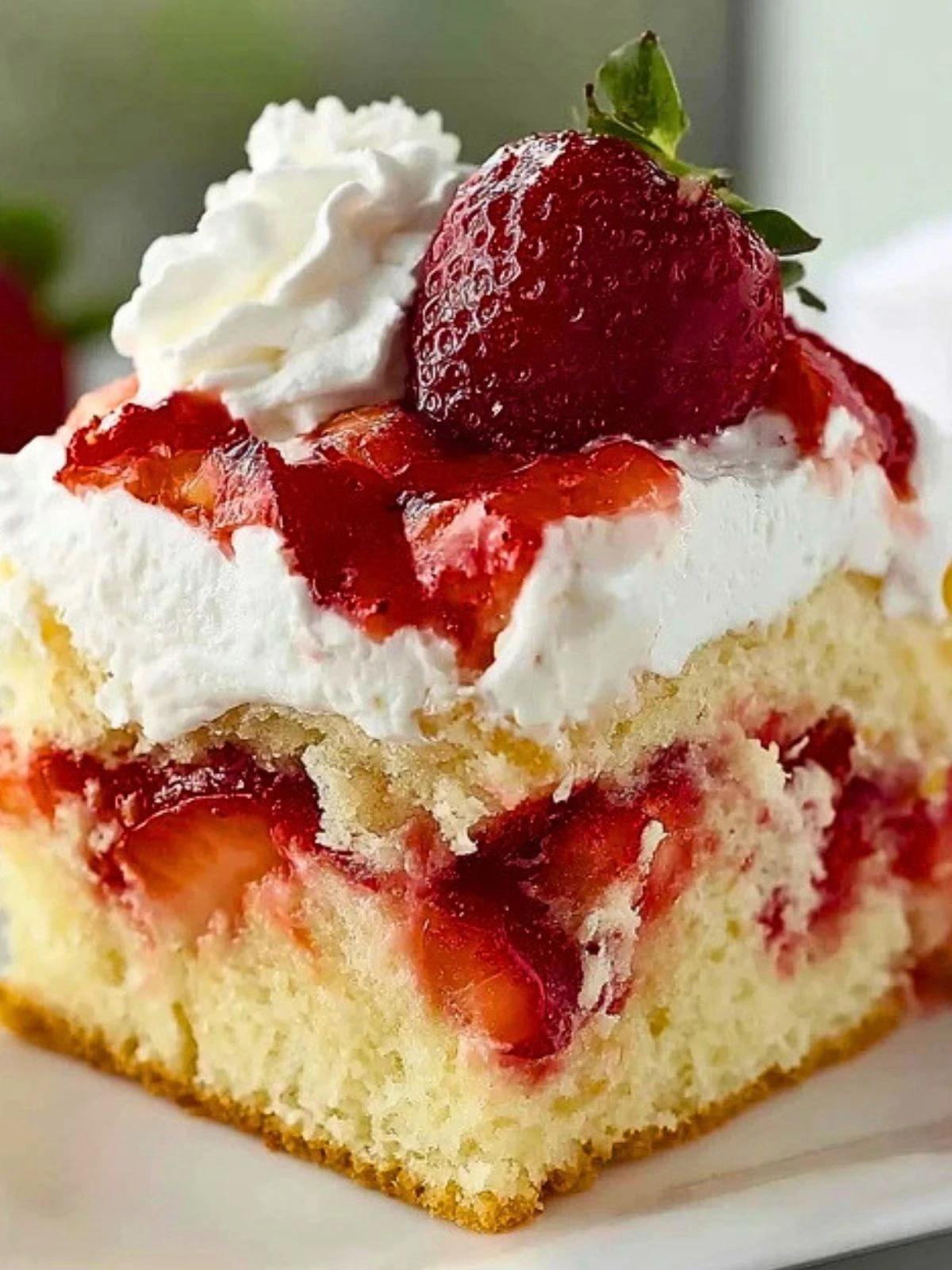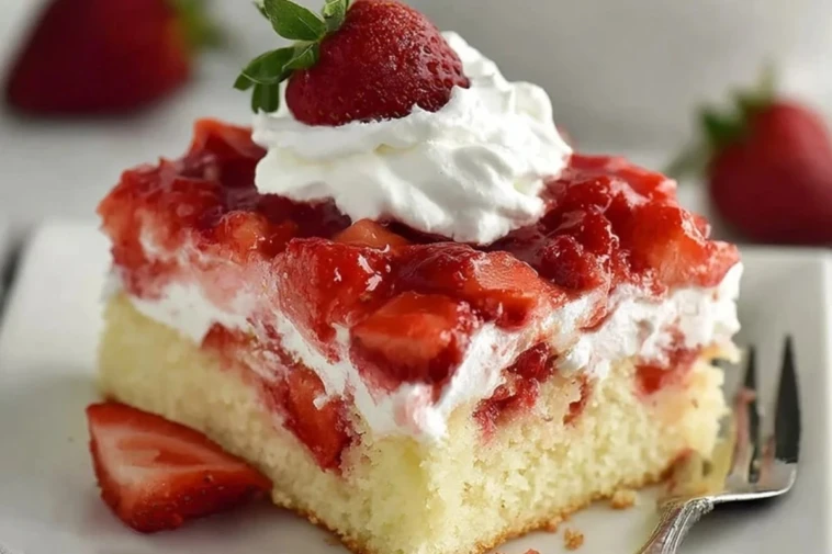 Another reason this cake stands out is the balance of textures. The cake stays soft and moist, the strawberries add brightness, and the whipped topping brings a creamy finish that keeps the whole dessert from feeling too heavy. It is sweet without being overwhelming, and it always looks beautiful with very little decorating effort.