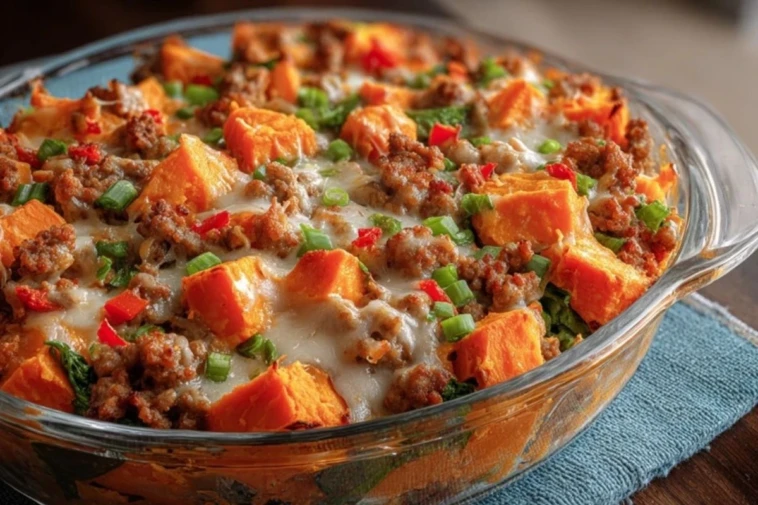 This Sweet Potato and Sausage Casserole is the perfect hearty one-pan meal for cozy dinners or brunch. Packed with roasted sweet potatoes, savory sausage, onions, herbs, and melty cheese, it’s a family-friendly casserole recipe that’s satisfying, simple, and flavorful. Great for meal prep and freezer-friendly too.