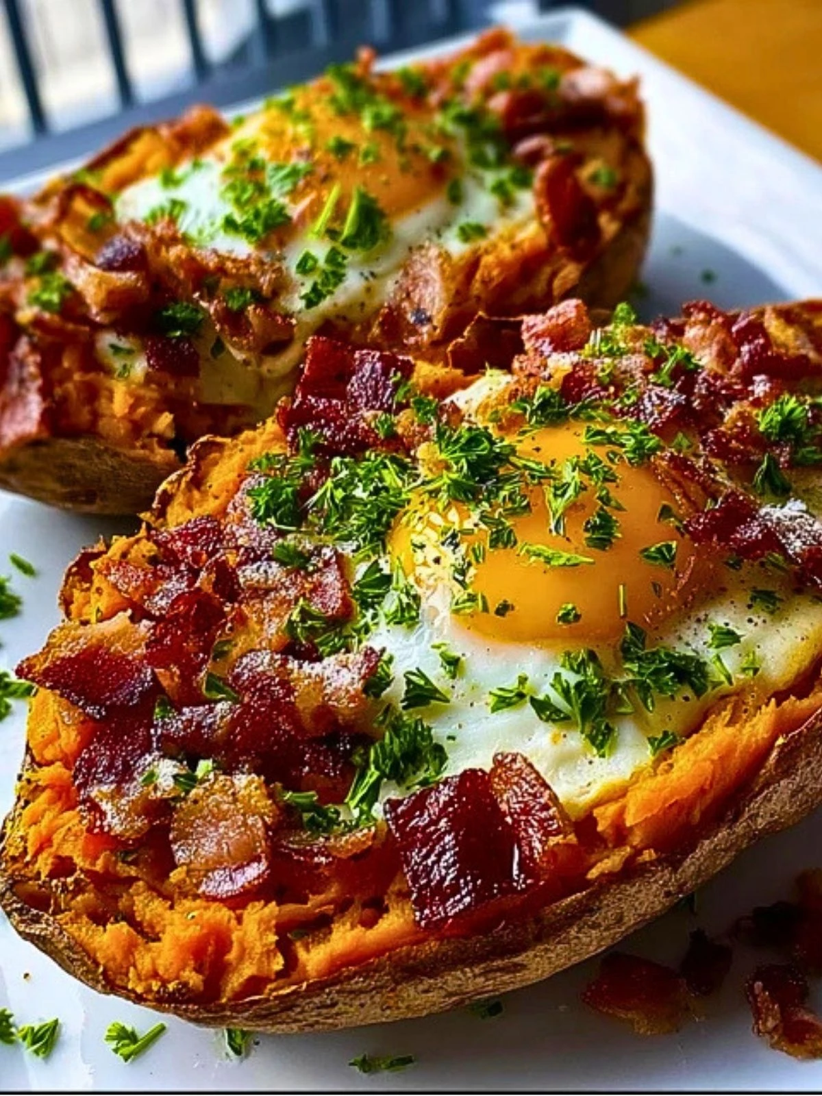 Return the filled sweet potatoes to the oven and bake for about 12 to 15 minutes, or until the eggs are set to your liking and the cheese has melted. The centers should look softly cooked and the tops should be lightly golden.