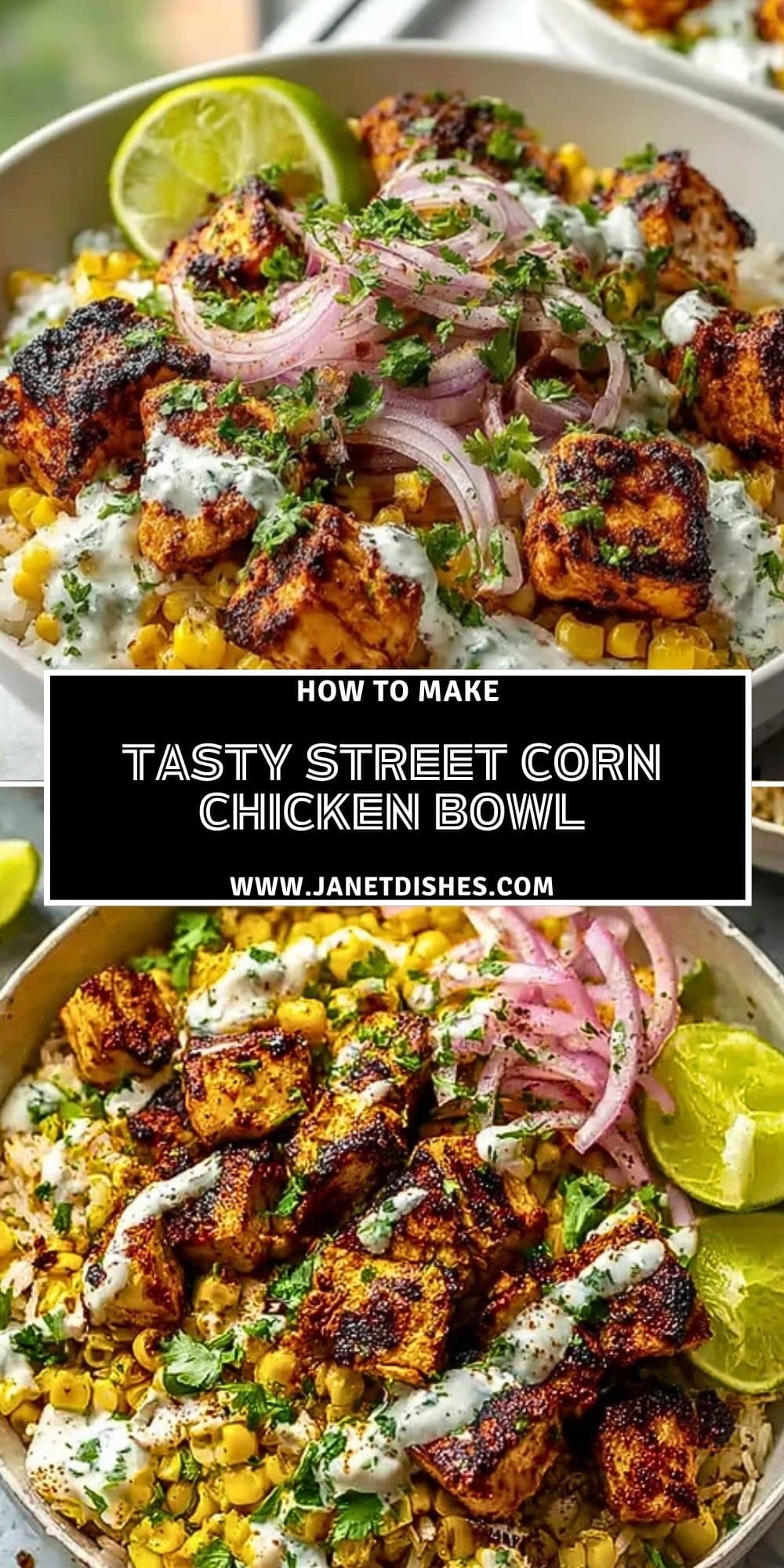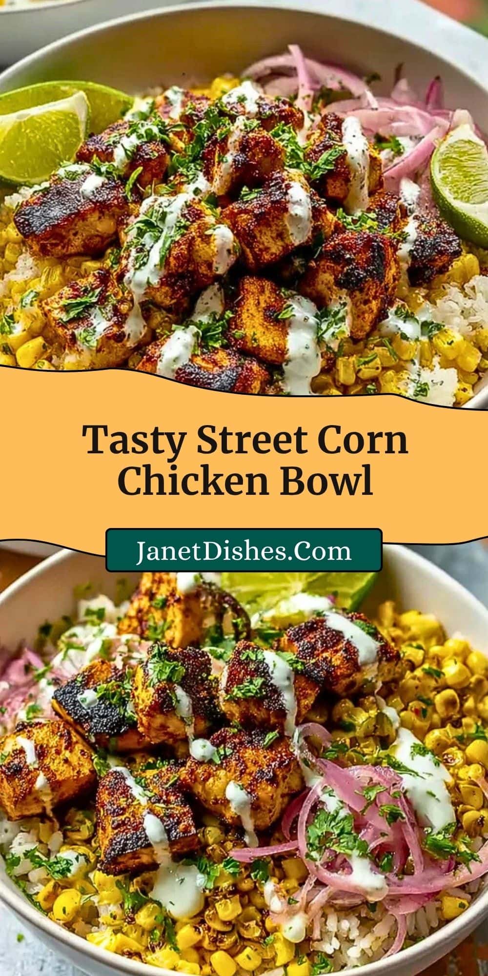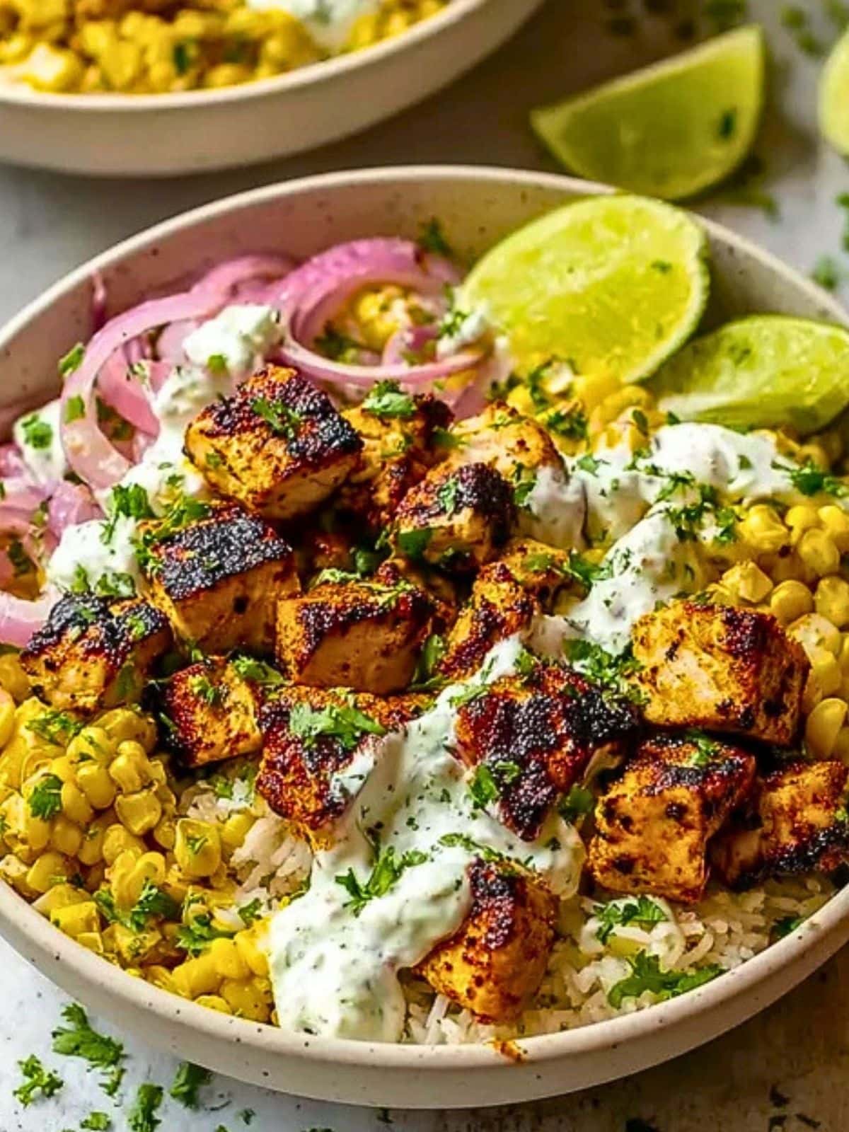A bold and healthy Tasty Street Corn Chicken Bowl made with grilled chicken, roasted corn, creamy lime sauce, cotija cheese, and rice. Perfect for meal prep, quick dinners, and gluten-free diets.