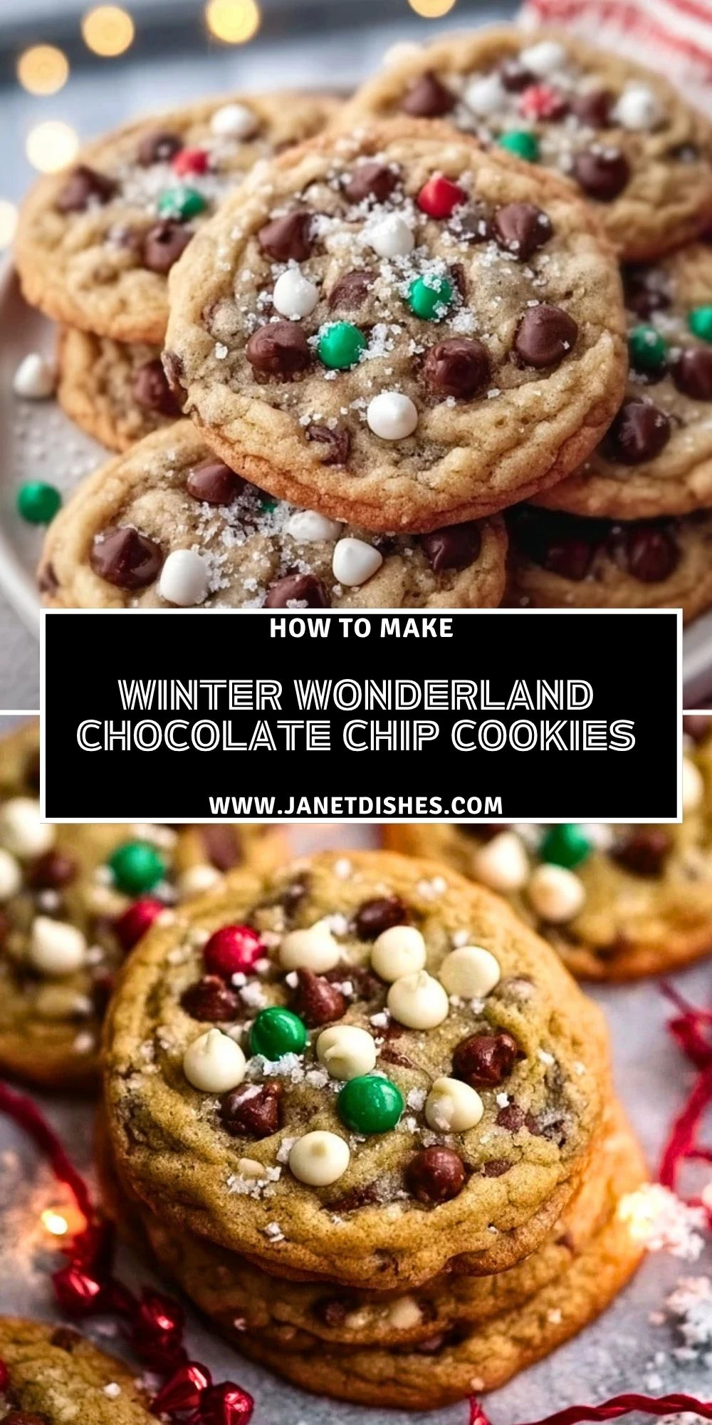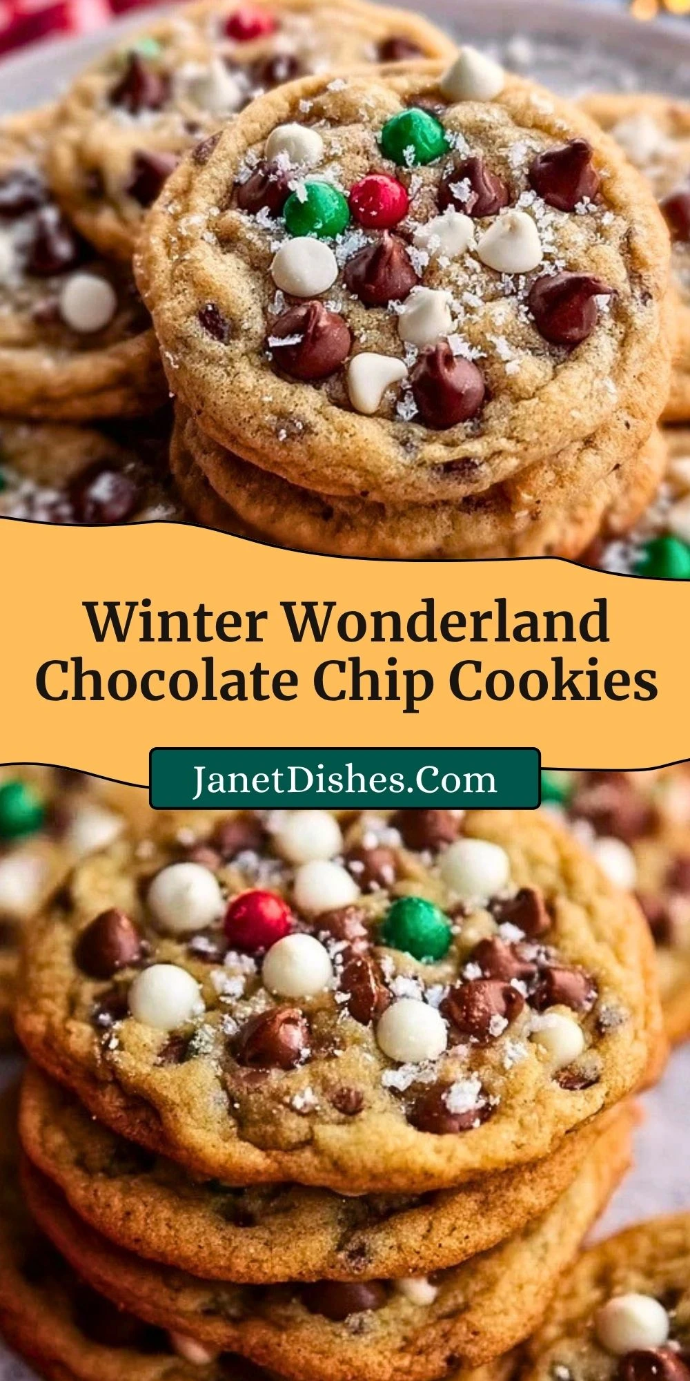If you love these Winter Wonderland Chocolate Chip Cookies, you might also enjoy a few more sweet bakes from Janet Dishes. Classic French Butter Cookies are delicate and buttery with a lovely holiday feel. Peanut Butter Smores Sandwich Cookies bring a richer, more indulgent cookie option. Churro Cheesecake Donut Cookies are perfect when you want something playful and bakery style. One-Bowl Banana Chocolate Muffins are another easy chocolate treat to keep in your baking rotation. Irresistible Blueberry Lime Cheesecake Cupcakes add a bright dessert option when you want a change from cookies.